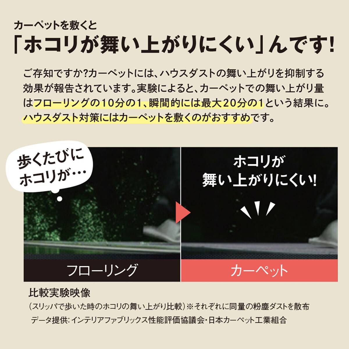 カーペットには、ハウスダストの舞い上がりを抑制する効果が報告されています。実験によると、カーペットでの舞い上がり量はフローリングの10分の1、瞬間的には最大20分の1という結果に。ハウスダスト対策にはカーペットを敷くのがおすすめです。