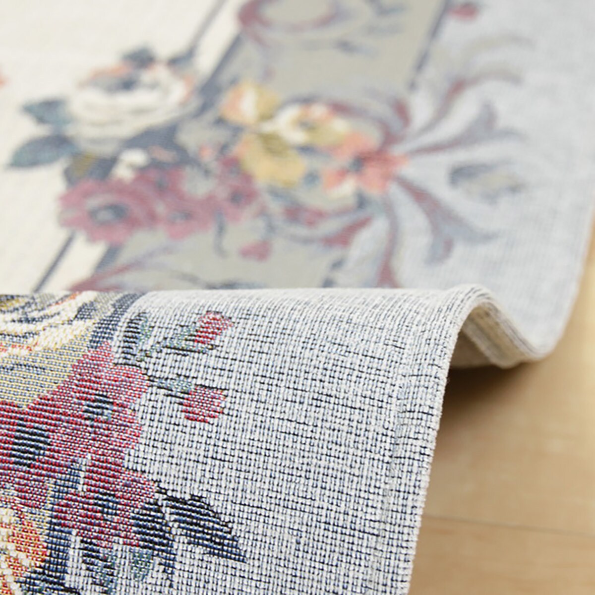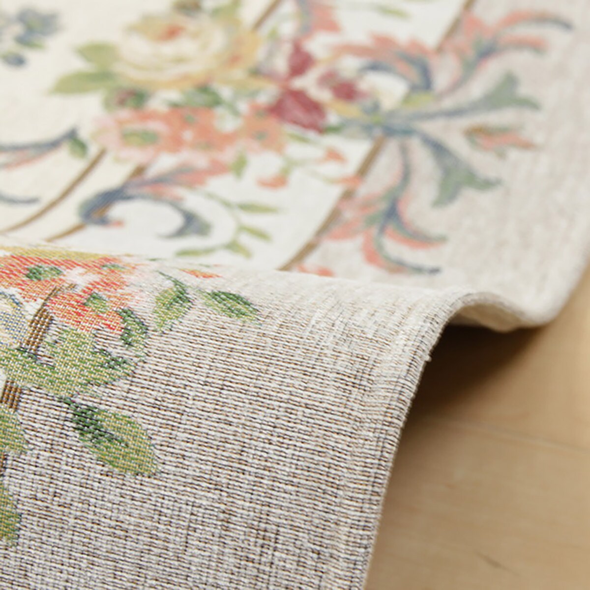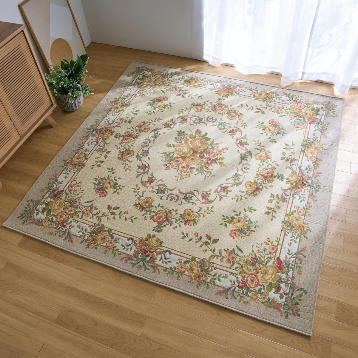 重厚感のあるゴブラン織りでエレガントな花束を表現。サラッとした肌ざわりで一年中心地よく、毛足が短いのでお手入れも簡単です。裏面は床を傷つけない不織布貼り。