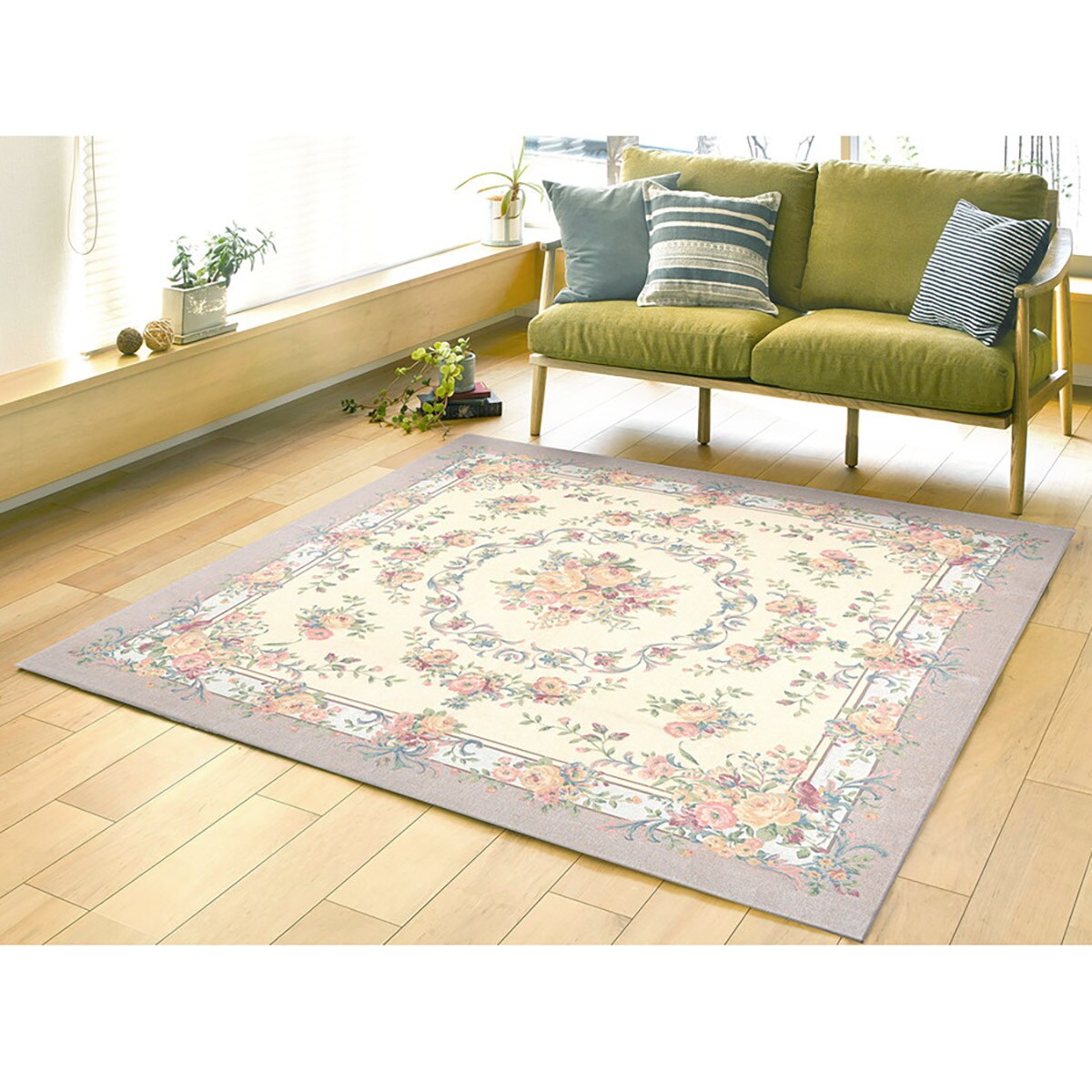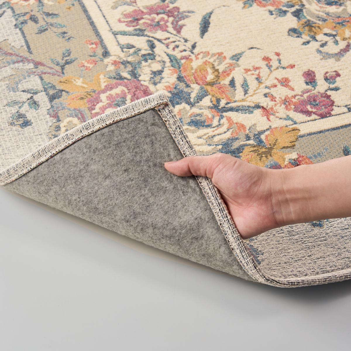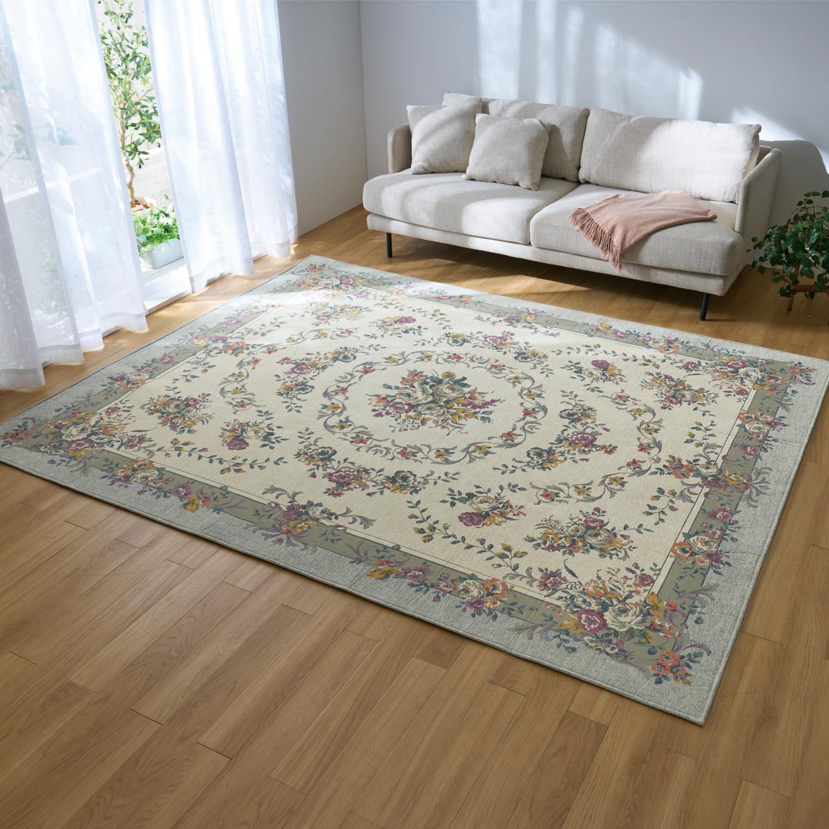 重厚感のあるゴブラン織りでエレガントな花束を表現。サラッとした肌ざわりで一年中心地よく、毛足が短いのでお手入れも簡単です。裏面は床を傷つけない不織布貼り。