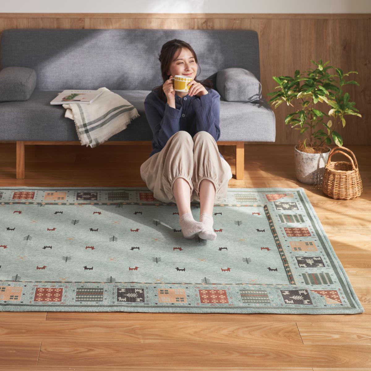 さらりとしたジャカード織りで一年中快適。毛足がないのでほこりなどが絡まりにくく、掃除機掛けもスムーズです。裏面にはすべりにくい加工を施しています。ラグを入れて丸洗いできる洗濯ネット(3畳用)付き。