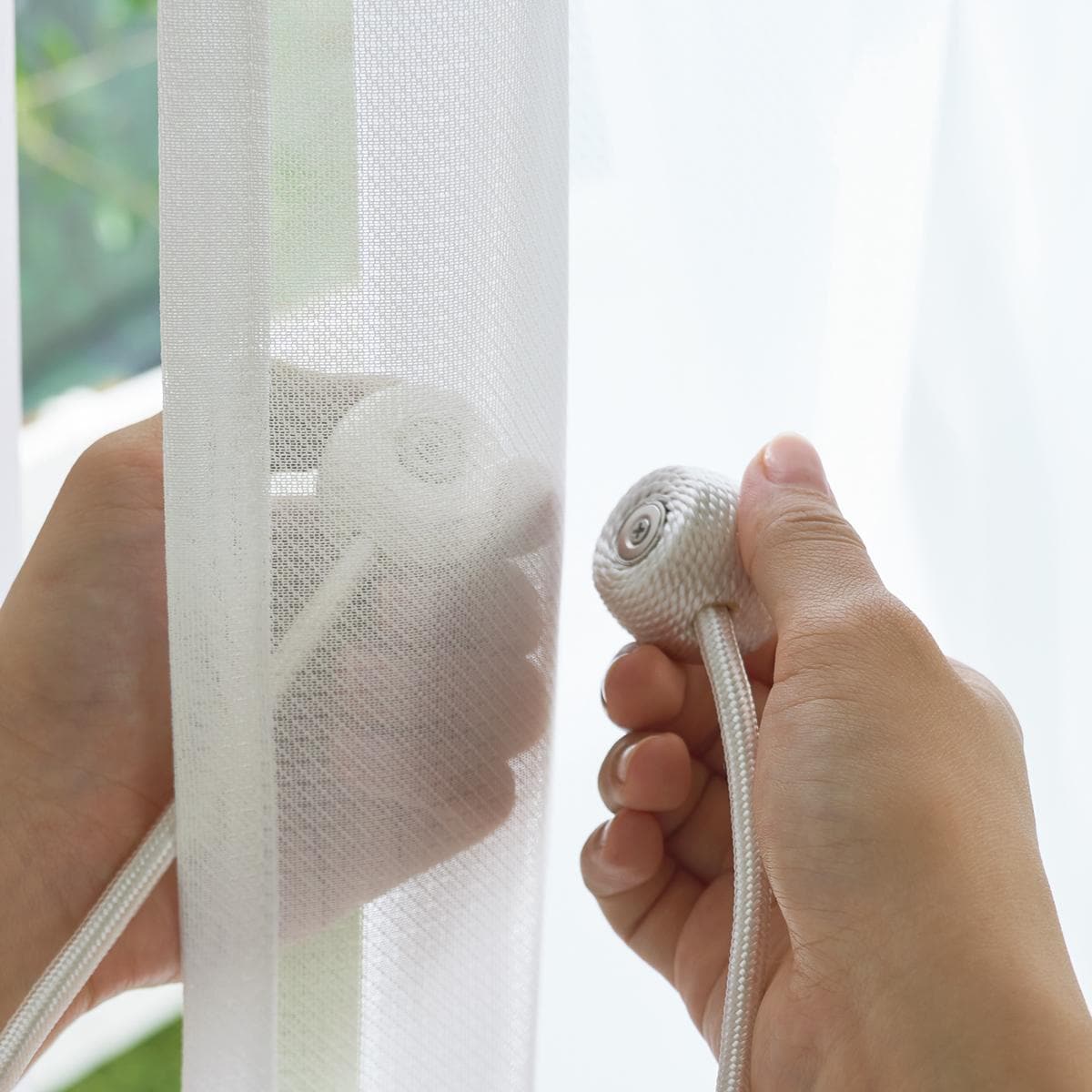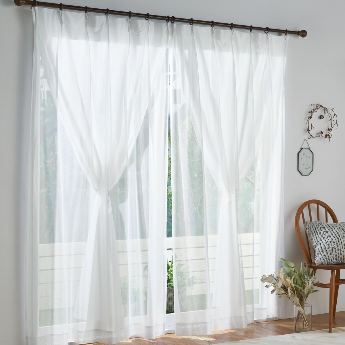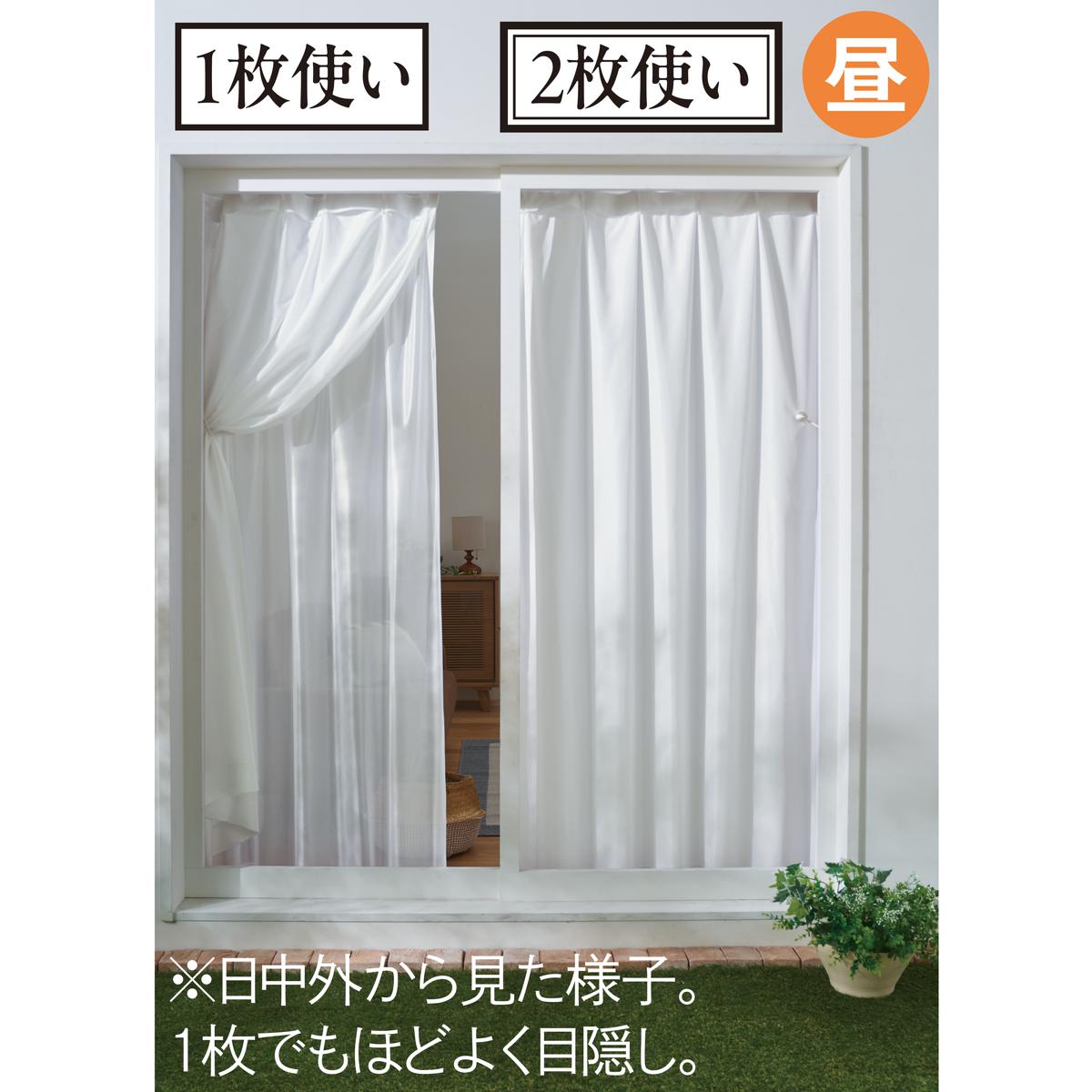 【1枚使いも2枚使いも、ワンタッチで自由にアレンジ】目隠しも透け感も思いのままにコントロールできる、新感覚2WAYレースカーテン。昼は1枚で、目隠ししながらふんわり開放感!付属のマグネットタッセルを好きな高さではさむだけで、スッとまとめられます。上部だけ縫い合わせた2種類のミラーレースを重ねた2枚仕立てで、2枚使いすれば夜はしっかり視線をブロック。さらに遮熱・保温効果もアップし、冷暖房費節約も期待できます。形状記憶加工付きでゆったりときれいなドレープがキープします。