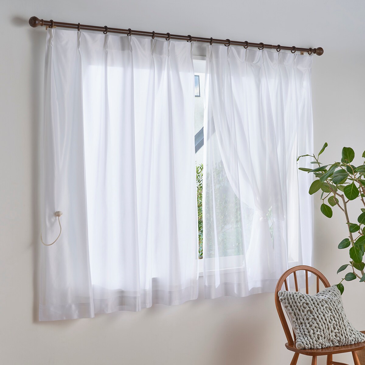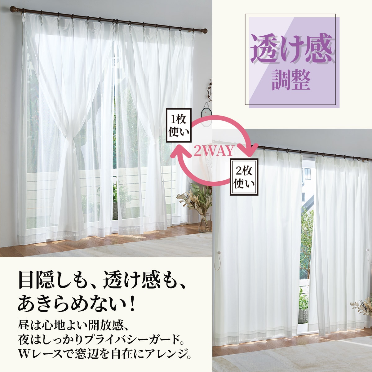 【1枚使いも2枚使いも、ワンタッチで自由にアレンジ】目隠しも透け感も思いのままにコントロールできる、新感覚2WAYレースカーテン。昼は1枚で、目隠ししながらふんわり開放感!付属のマグネットタッセルを好きな高さではさむだけで、スッとまとめられます。上部だけ縫い合わせた2種類のミラーレースを重ねた2枚仕立てで、2枚使いすれば夜はしっかり視線をブロック。さらに遮熱・保温効果もアップし、冷暖房費節約も期待できます。形状記憶加工付きでゆったりときれいなドレープがキープします。