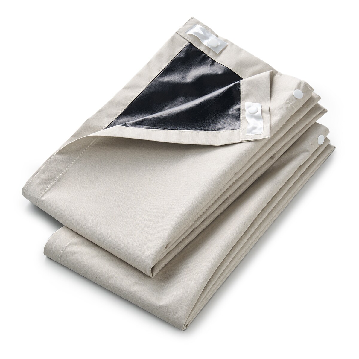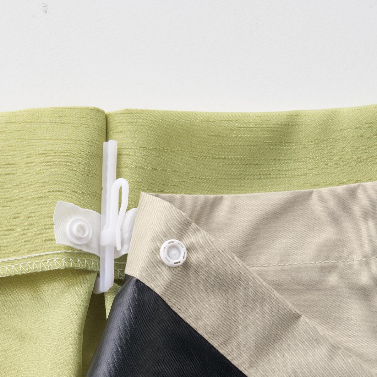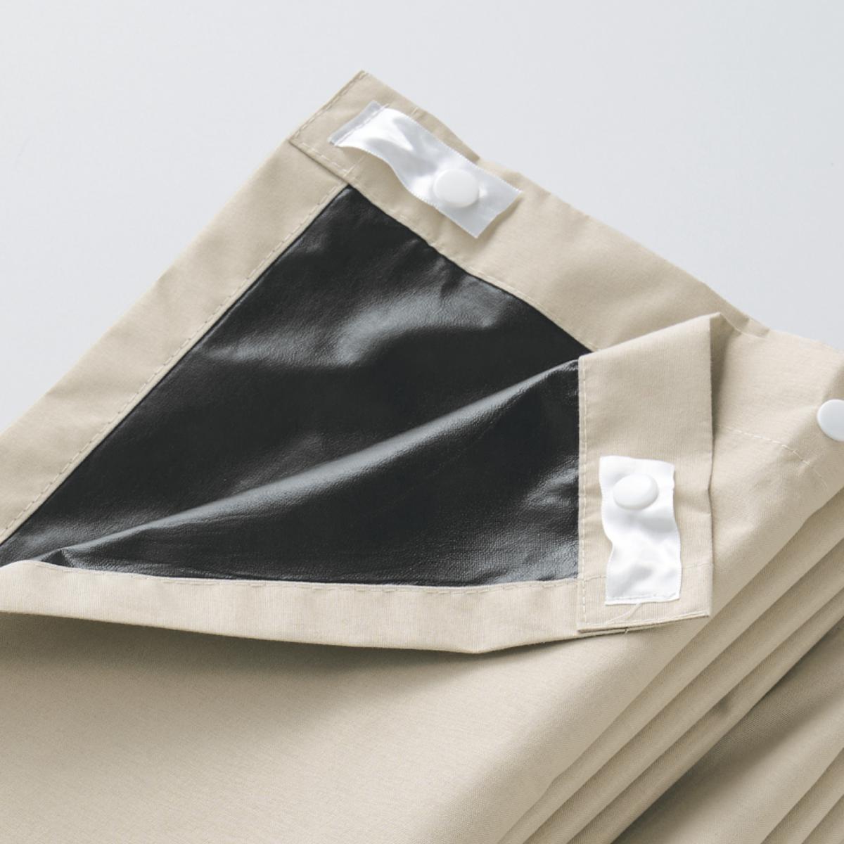 スナップボタンで簡単に装着できます。カーテンのアジャスターフックにつけるだけで効果がアップします。ベージュ生地に黒フィルム加工を施し、薄手で軽いライナー生地です。
