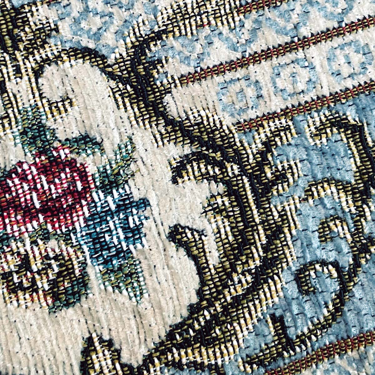 ブーケをモチーフにしたフレームデザインのメダリオン柄を、モールのような光沢のあるシェニール糸で織り上げたジャカード織。繊細な色の濃淡もしっかりと表現されていて高級感が漂います。しっかりとした密度で織られたイタリア製のジャカード織生地は、フラットな仕上がりで、上質でやわらかな風合いが魅力です。汚れたら洗濯機で手軽に丸洗いできるので、いつでも清潔にお使いいただけます。