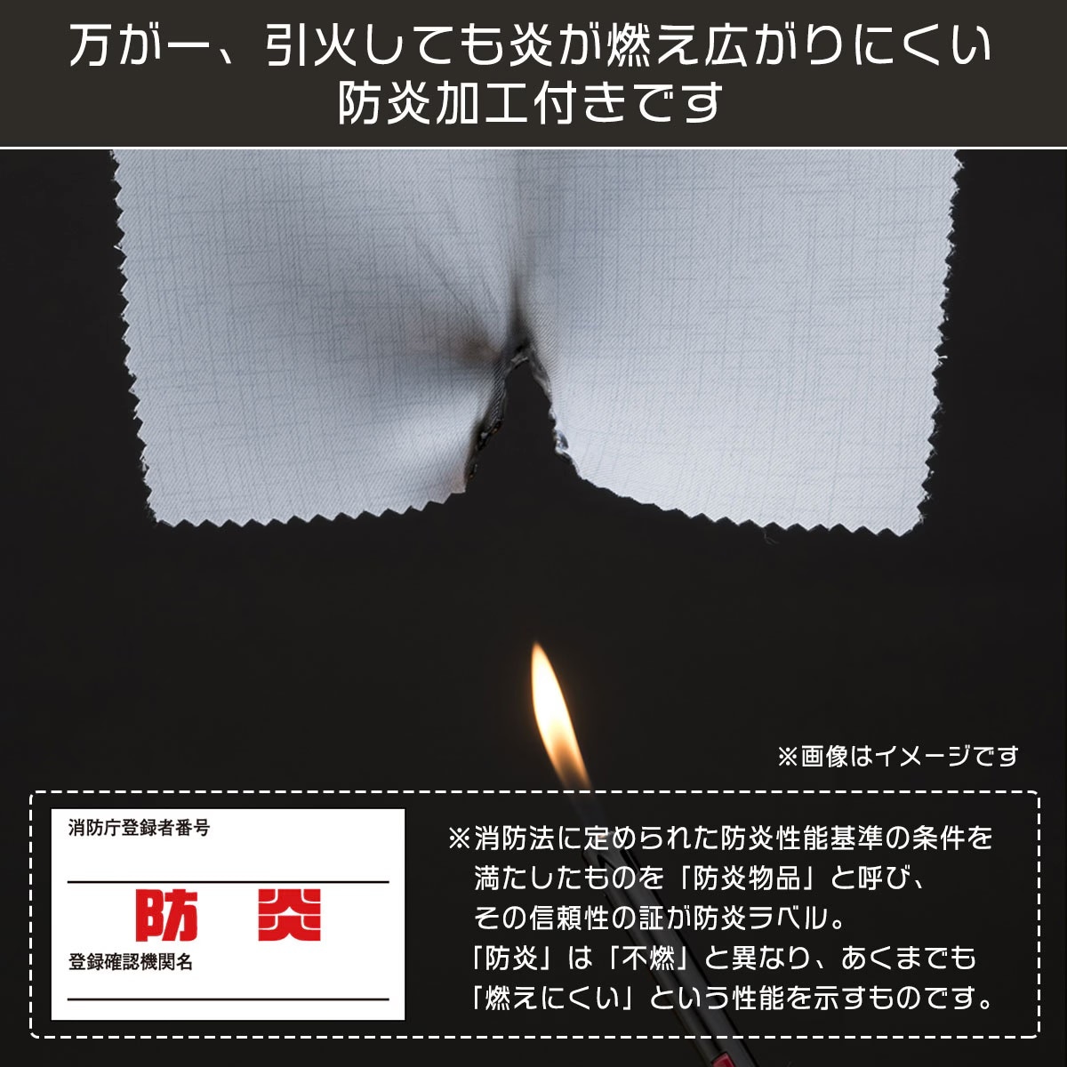 万が一引火しても炎が燃え広がりにくい防炎加工付き。※防炎は不燃とは異なり、あくまでも燃えにくいという性能を示すものです。