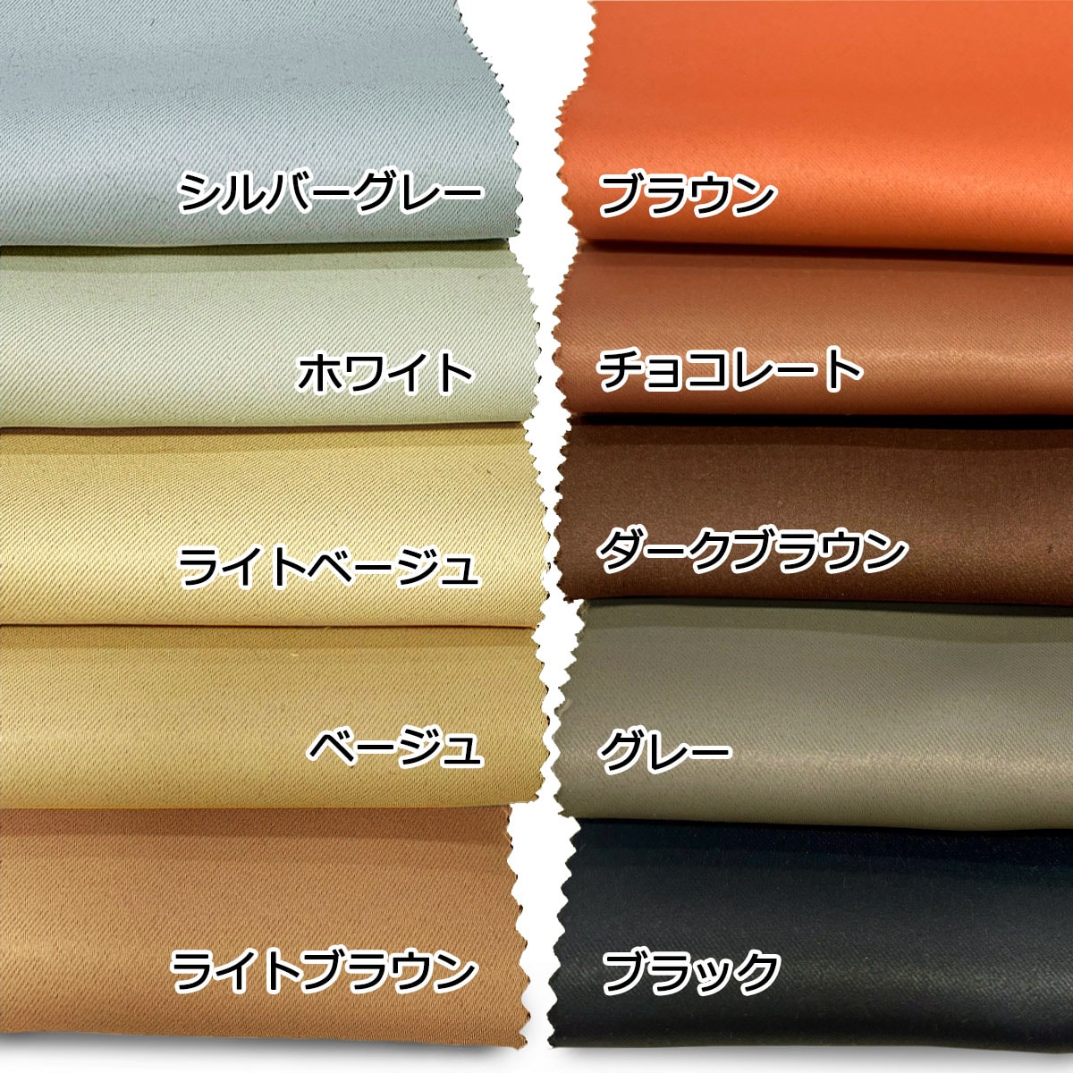 防炎遮光カーテンの選べる45色シリーズ(ベージュ・ブラウン・モノトーン系)。部屋馴染みのいいベーシック色からダーク系まで豊富なカラーが選べます。柔らかくなめらかな肌ざわりのサテン生地の無地(日本製)。しっかり光をカットし、防炎機能も。