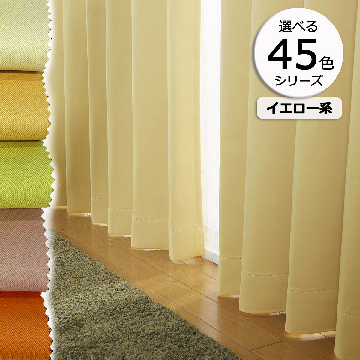 防炎遮光カーテンの選べる45色シリーズ(イエロー・オレンジ系)。やさしい色からビビット系まで豊富なカラーが選べます。柔らかくなめらかな肌ざわりのサテン生地の無地(日本製)。しっかり光をカットし、防炎機能も。