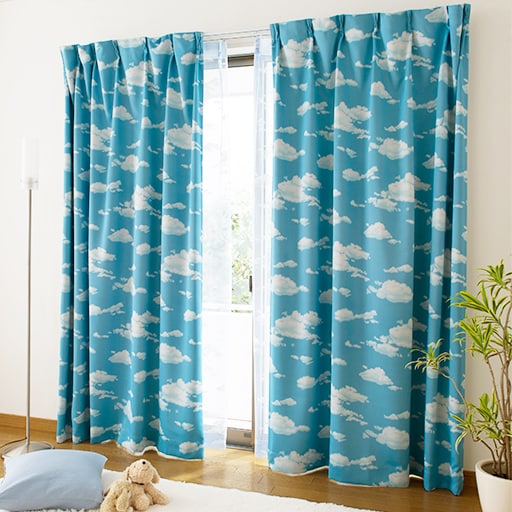 鮮やかなブルーの生地にふわふわ浮かぶ雲が、窓辺を明るく爽やかに演出する青空模様の遮光カーテンです。ほどよく光をやわらげる2級遮光で、子供部屋にも人気の柄です。形状記憶加工を施しているので、届いたときからキレイなドレープが長続き。小窓から幅広窓まで対応できる、充実のサイズ展開をご用意しました。汚れても丸洗いできるので、清潔にお使いいただけます。