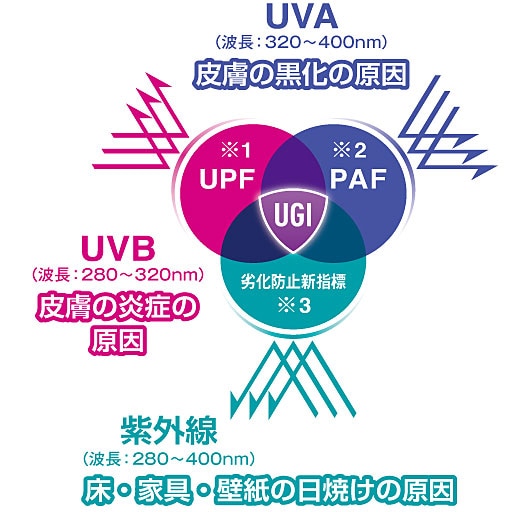 UGIは、一般的なUVカット付き化粧品にもよく使われる、3つの紫外線に注目し、人体・家具・床などの日焼け防止も含め、インテリアの観点から総合的に判断した指標です。