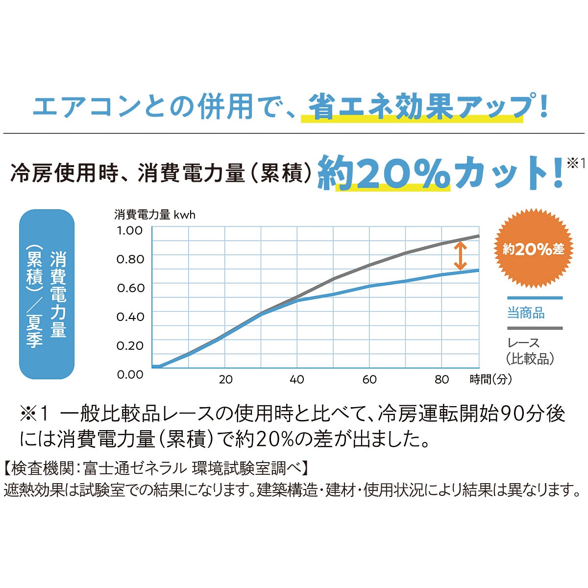 ※1一般比較品レースの使用時と比べて、冷房運転開始90分後には消費電力量(累積)で約20%の差が出ました。