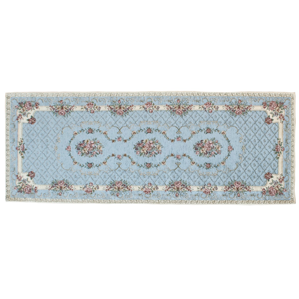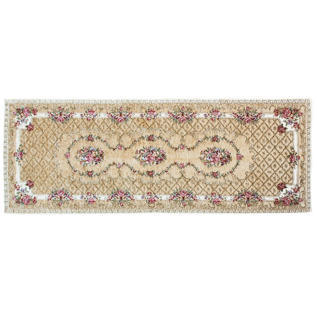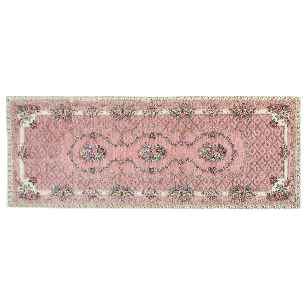 (左から) ピンク・ベージュ・ブルー(横240×縦65cm)エレガントなブーケ柄のシェニール織りキッチンマットです。