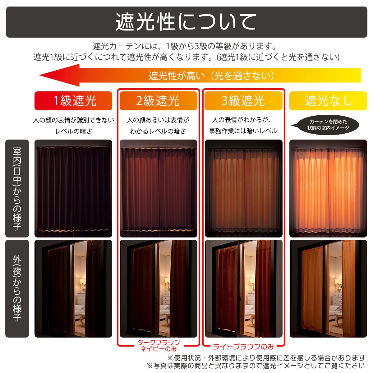 【遮光性について】1級から3級の等級があります。遮光1級に近づくにつれて遮光性が高くなります(遮光1級に近づくと光を通さない)。※使用状況・外部環境により使用感に差を感じる場合があります。写真は実際の商品と異なりますので遮光イメージとしてご覧ください。