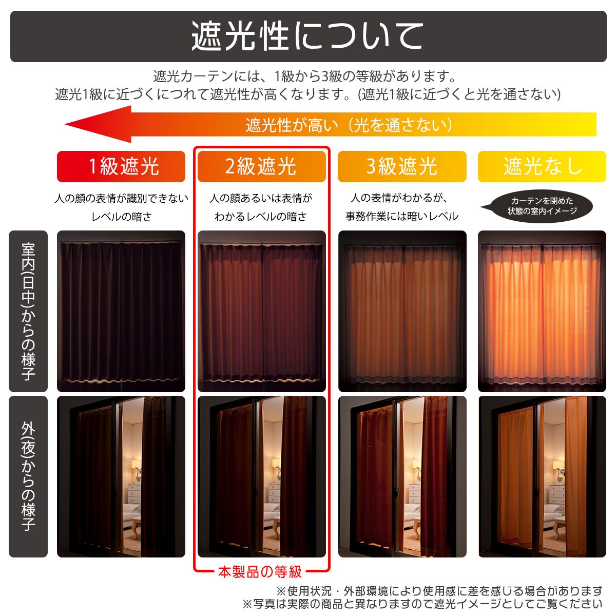 【遮光性について】1級から3級の等級があります。遮光1級に近づくにつれて遮光性が高くなります(遮光1級に近づくと光を通さない)。※使用状況・外部環境により使用感に差を感じる場合があります。写真は実際の商品と異なりますので遮光イメージとしてご覧ください。