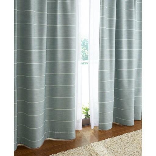 デニム地のようなナチュラルな素材感の無地調カーテンです。ボーダーのラインがアクセントになったおしゃれなデザイン。2級遮光でお部屋が暗くなりすぎず、ほどよく光をやわらげます。さらに防炎機能付きなので高層マンションにお住まいの方はもちろん、地震・火事に備えたい方にも。小窓から幅広窓まで対応できる、充実のサイズ展開をご用意しました。形状記憶加工を施しているので、届いたときからキレイなドレープが長続きします。汚れてもご家庭の洗濯機で丸洗いできるので、清潔にお使いいただけます。