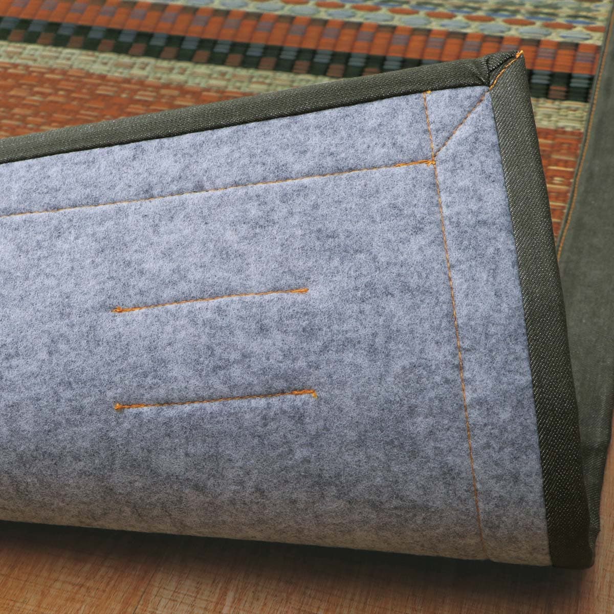 【快適に過ごせる「い草」の特徴】1.リラックスできる清々しい香りい草に含まれる芳香成分には、森林浴と同じような癒やし効果があります。2.「呼吸」によって室内の湿度を調整い草は内部に多くの気孔があり、夏は湿気を吸収して涼しく、冬は水分を放出してあたたかく保つ性質を備えています。3.空気をキレイにして消臭効果もい草は空気中の有害物質を吸着し、汗臭などの原因物質も低減。空気を健やかに保ちます。■[表地]い草(ヒバエッセンス加工) [裏地]サイズ4・90/ウレタンフォーム サイズ15・32・33・57/不織布 [ヘリ]綿100%(デニム) ■[厚み]サイズ4・90/約8mm サイズ15・32・33・57/約6mm ▼天然素材商品の為、商品によって色柄・サイズ・風合いが多少異なる場合があります。●裏面はすべりにくい仕様 ●折りたたんだ状態でお届けします ●日本製【汗消臭】 【抗菌防臭】(ヒバエッセンス加工)【小型別配送】※沖縄県や一部島しょ部など配送上の都合によりお届けできない地域がございます。