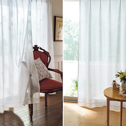 上品な無地調の格子柄と、さりげなく華やぐローズ柄の2柄をご用意した、透け感が心地よいレースカーテンです。お部屋を暗くしたくない、外の景色もほんのり感じたいという方におすすめ。