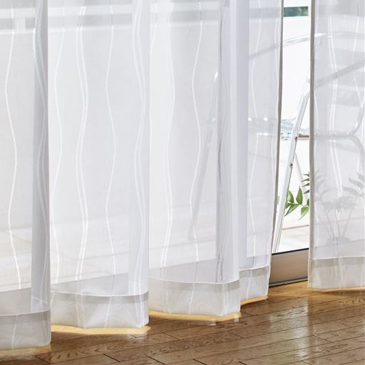 オフホワイト波打つシンプルなウエーブストライプ柄が魅力のレースカーテンです。