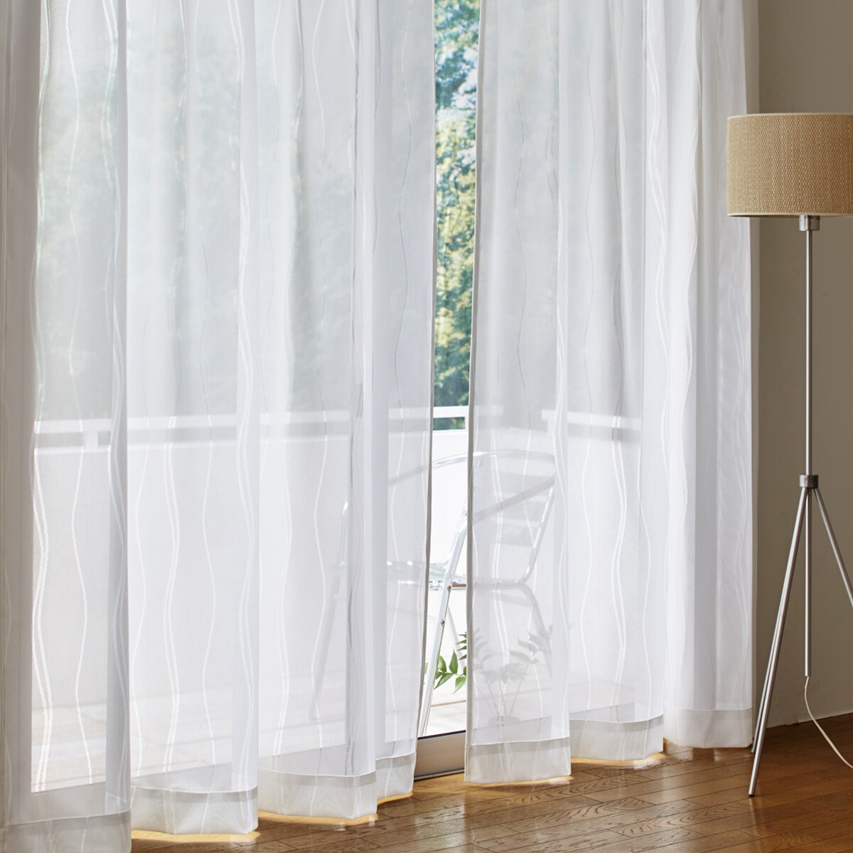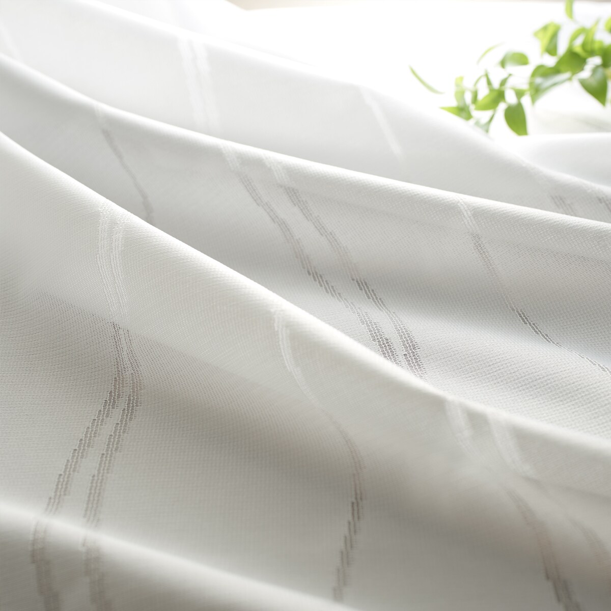 オフホワイト波打つシンプルなウエーブストライプ柄が魅力のレースカーテンです。