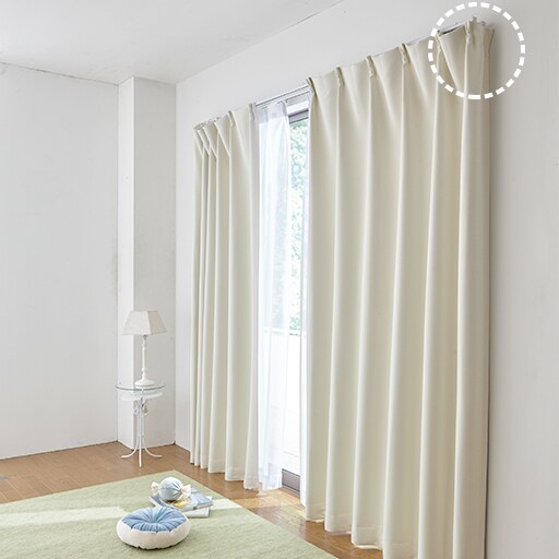 カーテンの両サイドを包むリターン縫製仕様で、隙間から侵入する光や冷気を徹底ブロック。 ※幅の長さが通常品よりも約10cm長くなります。左右のフックはレース側のフックにかけてください。