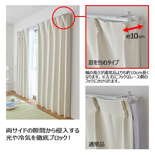 カーテンの両サイドを包むリターン縫製仕様で、隙間から侵入する光や冷気を徹底ブロック。※幅の長さが通常品よりも約10cm長くなります。左右のフックはレース側のフックにかけてください。