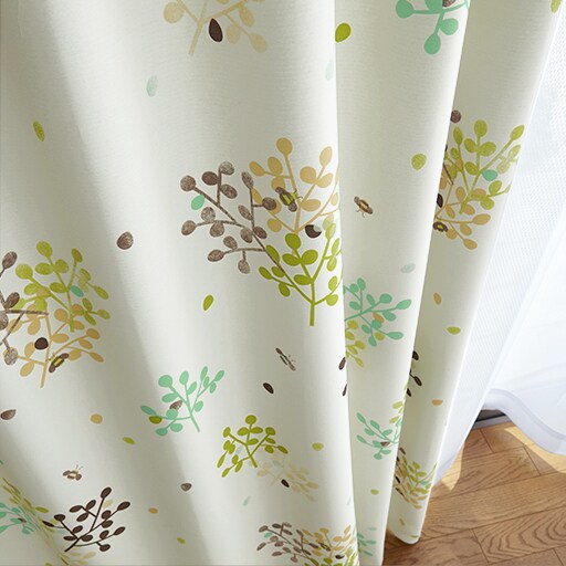 【ネット限定】カジュアルタッチのデフォルメされたリーフ柄がかわいい、プリント遮光カーテンです。ドットにまぎれる蜂が可愛いアクセントに。3級遮光でほどよく光をカットしてくれます。