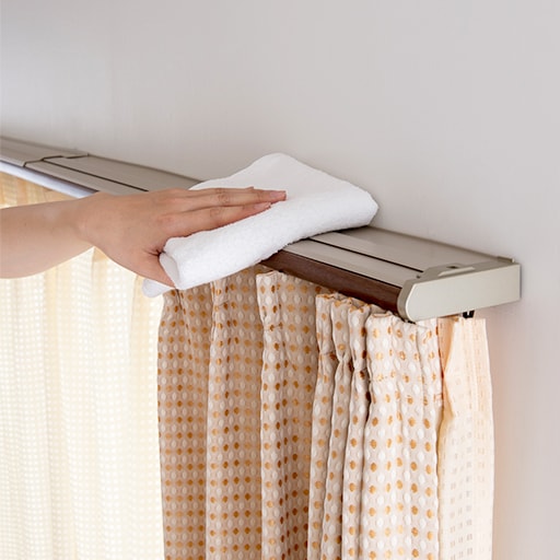 上からの光漏れ・すきま風を軽減する、カバートップ付きのカーテンレールです。伸縮タイプなので、窓に合わせて調整も可能。サッと拭けるのでお手入れも簡単です。