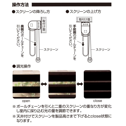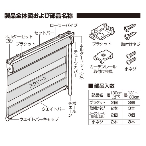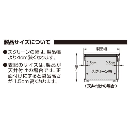 ■スクリーン/ポリエステル100%■取り付け部品/ブラケット・取り付けネジ・カーテンレール取り付け金具・小ネジ▼スクリーン生地は洗濯できません。▼付属の取り付けネジは木部用です。木部以外には使用しないでください。木部は25mm以上の厚みが必要です。【製品サイズについて】※スクリーンの幅は製品幅(=注文サイズ幅)よりも約4cm狭くなります。表記丈サイズは天井付けの場合です。正面付けにすると丈が1.5cm長くなります。●取扱説明書付き●インドネシア製【小型別配送】(サイズ6のみ大型)※沖縄県や一部島しょ部など配送上の都合によりお届けできない地域がございます。