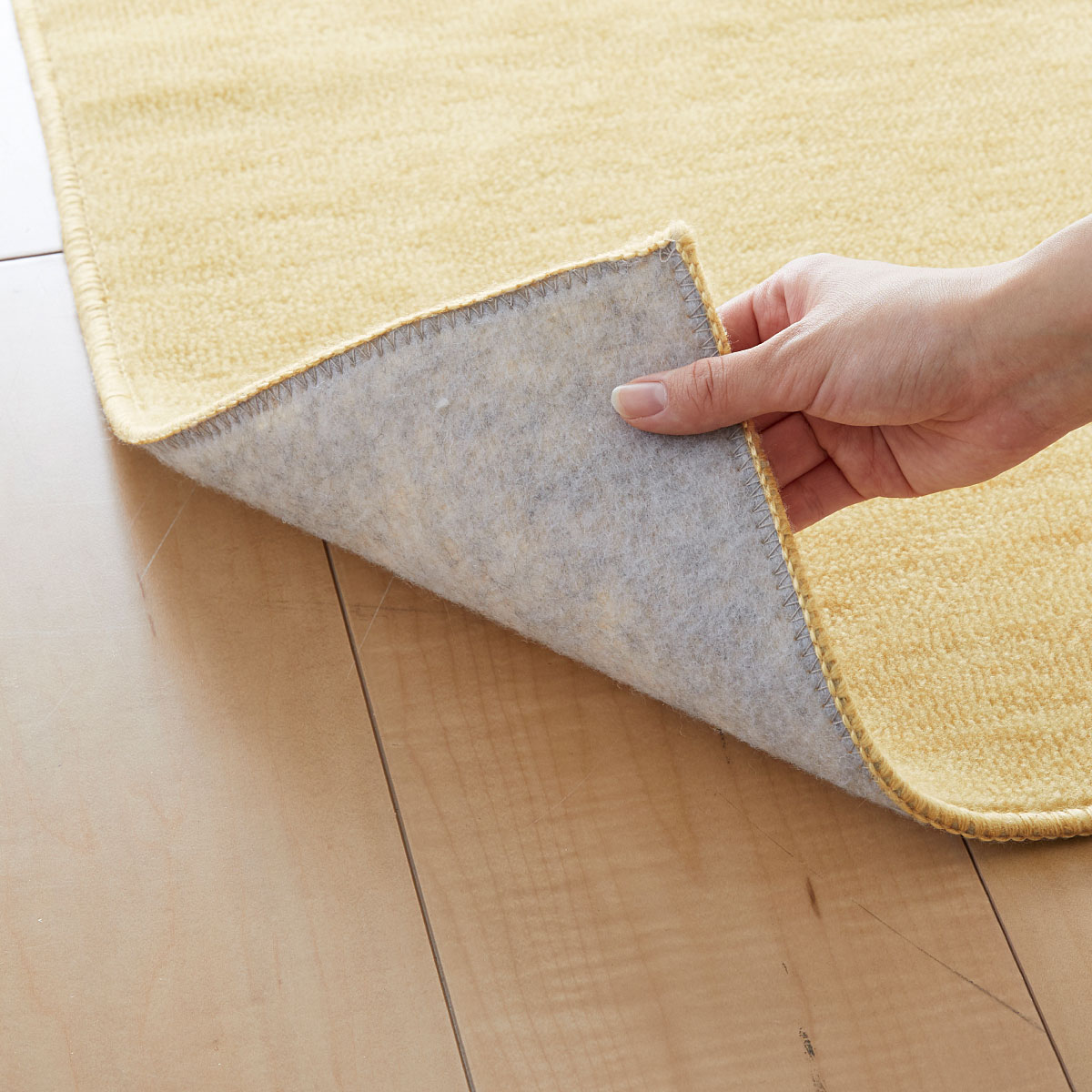 裏面は不織布貼りで、フローリングを痛めません。ラグサイズは市販のすべり止めシートと合わせてご使用いただきますと安全性が高くなります。