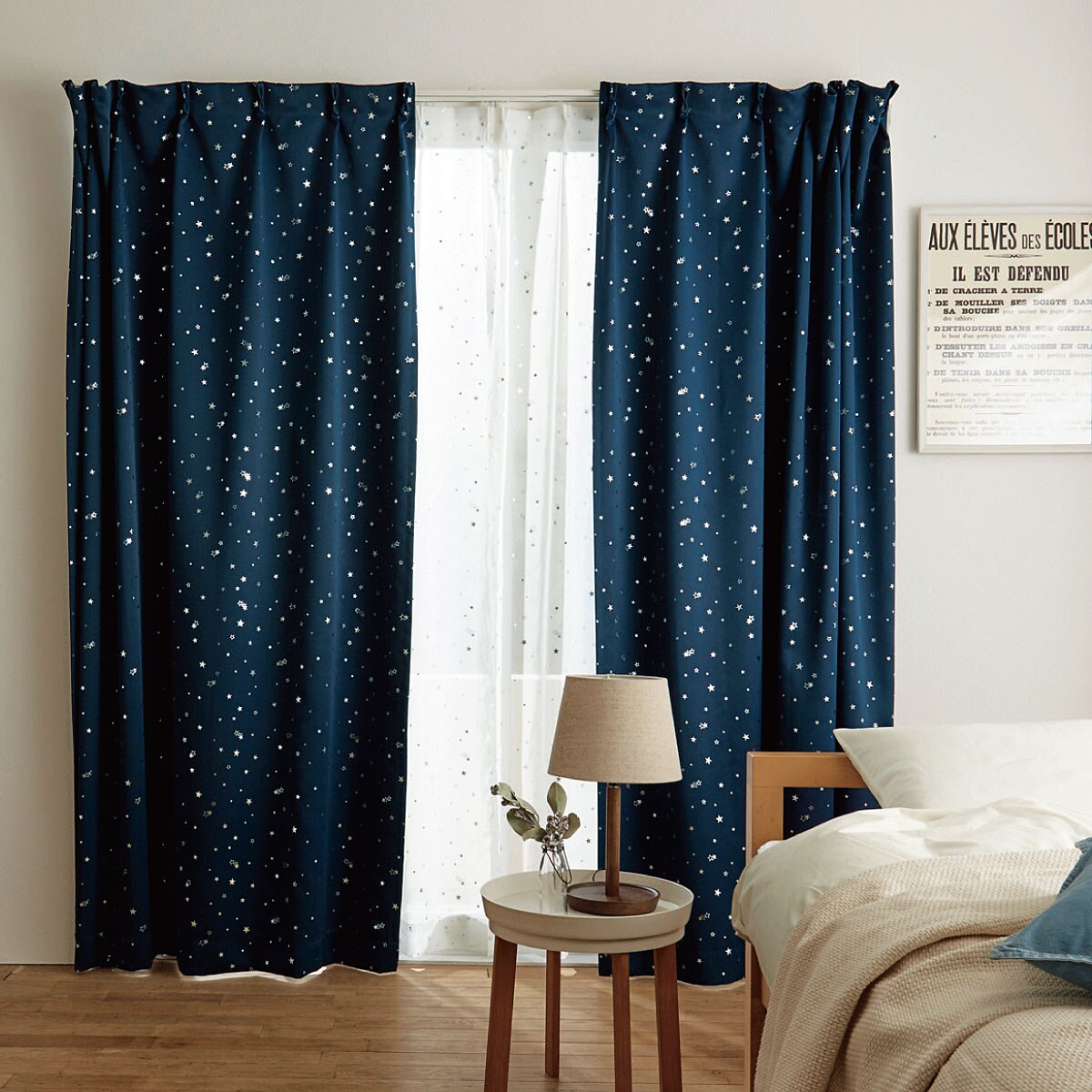 箔プリントで描かれたきらめく星がかわいいボイルカーテンです。お部屋が明るく優しい印象になり、自然な光の陰影をインテリアの一部として楽しむことができるのも魅力。同シリーズの遮光カーテンと組み合わせれば、まるで夜空を眺めているよう。子ども部屋や寝室にもぴったりです。小窓から幅広窓まで対応できる、充実のサイズ展開をご用意しました。汚れたらご家庭の洗濯機で丸洗いできるので、清潔にお使いいただけます。