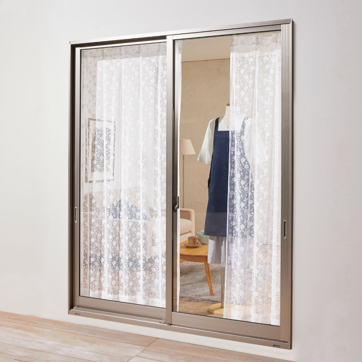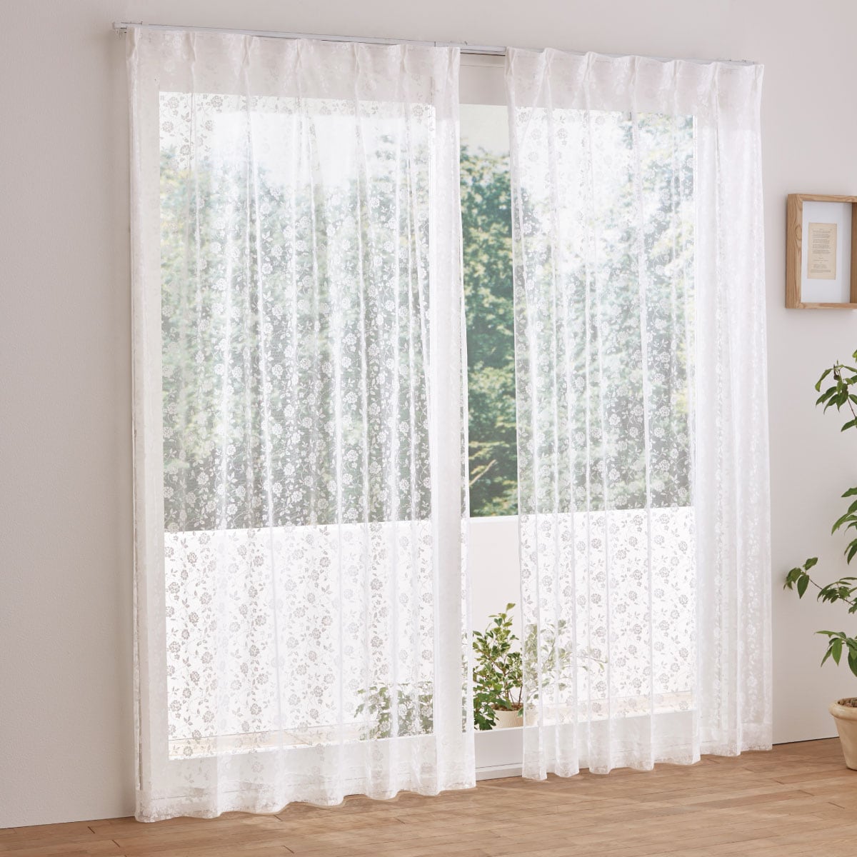 光に映えるチュール(ネット)生地に刺繍を施したレースカーテンです。小さなバラのモチーフをたっぷり全面に配した愛らしいデザイン。気持ちのいい日差しを招き入れて、お部屋にシルエットの花が咲き誇ります。ドレープカーテンの前に掛けるような使い方もおすすめ。レースカーテンはデザイン性を重視したいという方や、朝日を浴びて起きるのが好きという方にぴったりです。小窓から幅広窓まで対応できる、充実のサイズ展開をご用意しました。汚れたらご家庭の洗濯機で丸洗いできるので、清潔にお使いいただけます。