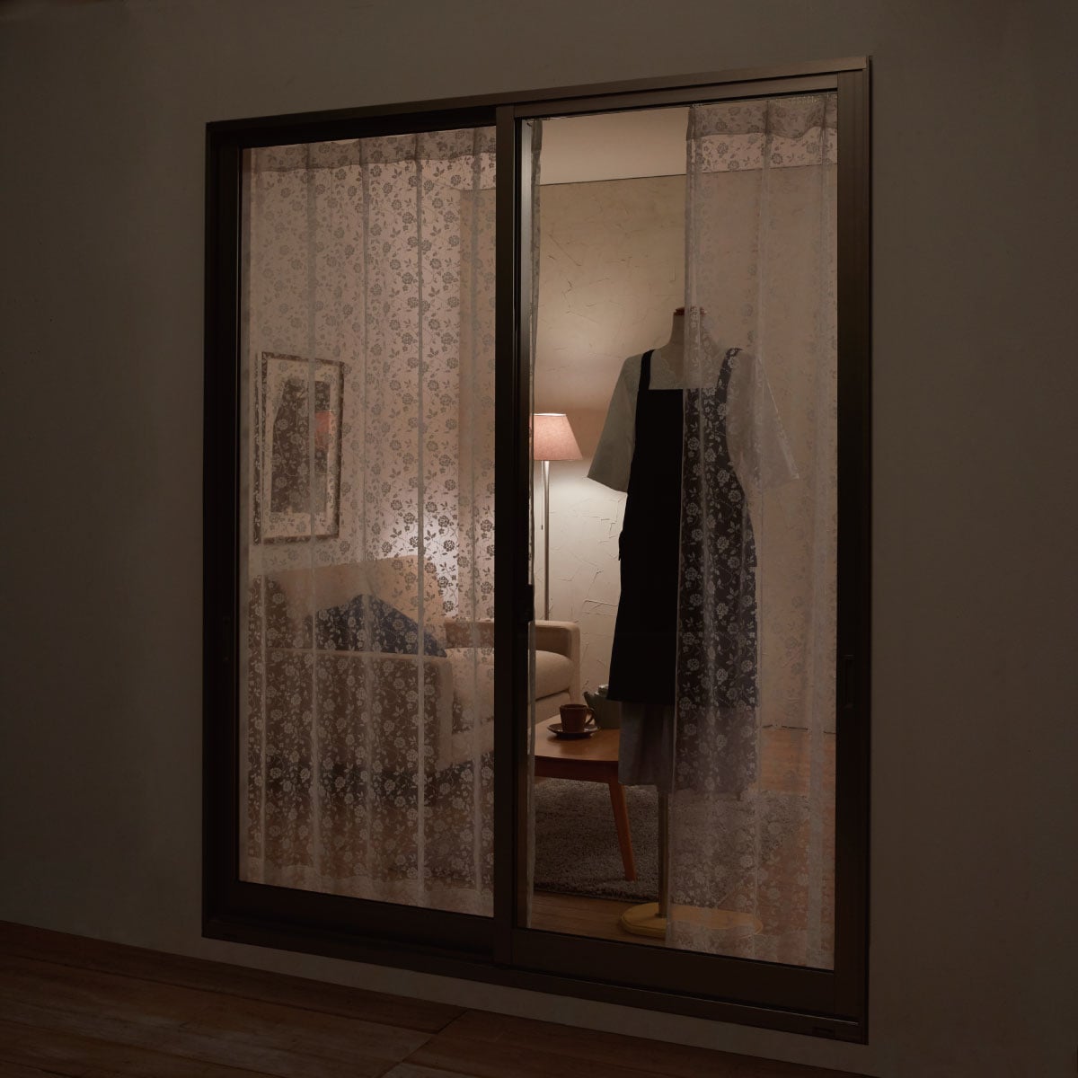 【レースカーテンの透け感の目安(室内からの様子)】UVカット率・遮熱保温効果・目隠し効果の高いレースカーテンは、一般的なレースカーテンに比べて室内から外が見えにくくなります。また、昼間はお部屋の中が若干暗く感じる場合があります。※商品の素材感や色味・使用環境により異なりますのであくまで目安としてください。