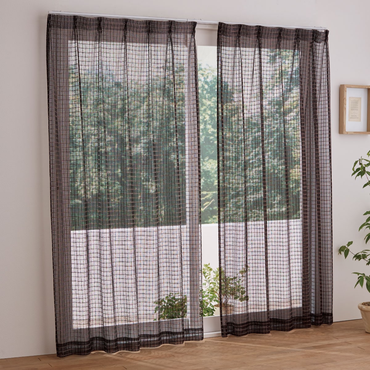 ざっくり編んだ透け感のある綿素材入りのレースカーテンです。太さの異なる5種類の糸で編み上げた格子柄から生まれる光の濃淡が、お部屋をリゾートホテルのような空間に。存在感のある生地なので、ドレープカーテンはシンプルめのものがおすすめ。レースカーテンはデザイン性を重視したいという方や、朝日を浴びて起きるのが好きという方にぴったりです。小窓から幅広窓まで対応できる、充実のサイズ展開をご用意しました。汚れたらご家庭の洗濯機で丸洗いできるので、清潔にお使いいただけます。