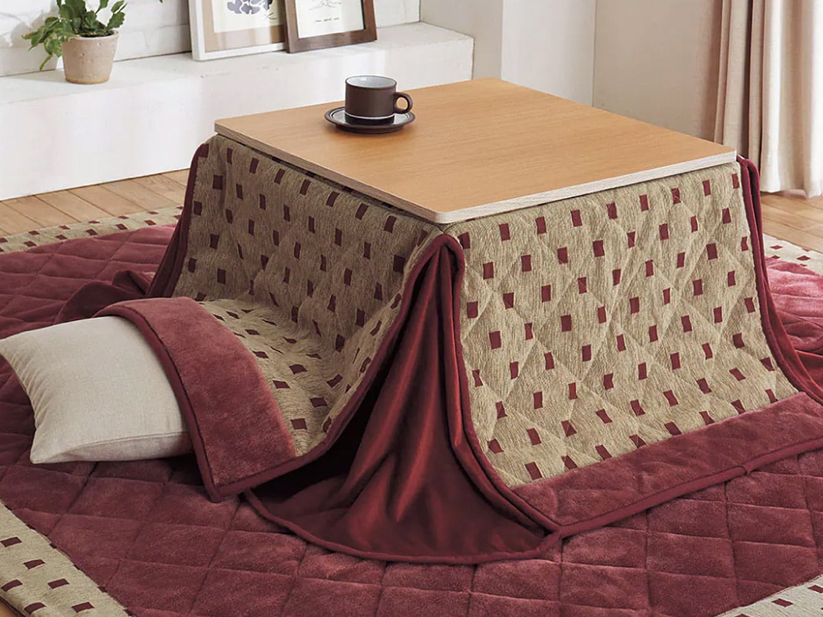 こたつ布団は、たっぷりの長さでしっかり保温できるものを。北欧風の落ち着いたカラーを選べば、インテリアにもセンスよくなじみます。