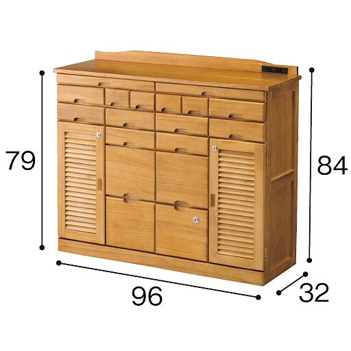 みんなが使う小物をまとめて収納。探し物の時間がぐ~んと減ります! 大小組み合わせた引き出しに扉収納、大切なものをしまえる鍵付き収納など、多彩な収納スペースがリビングのあれこれをまとめて収納します。桐天然木を使い、自然な風合いに仕上げました。