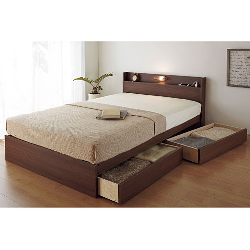 機能充実の照明付き収納ベッド。棚、照明、コンセント、引き出し2杯が付いたベッド。シンプルで長く使いやすいデザインに仕上げました。