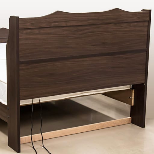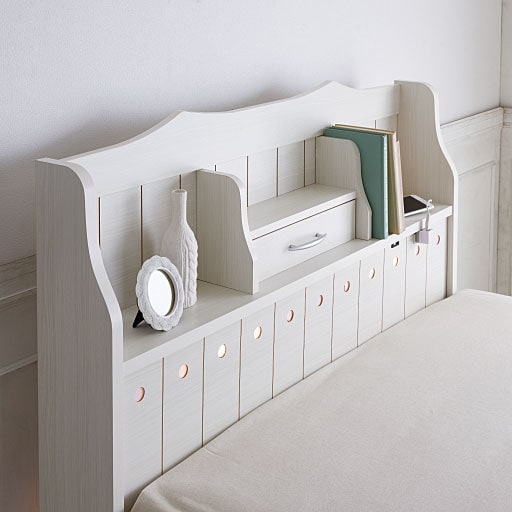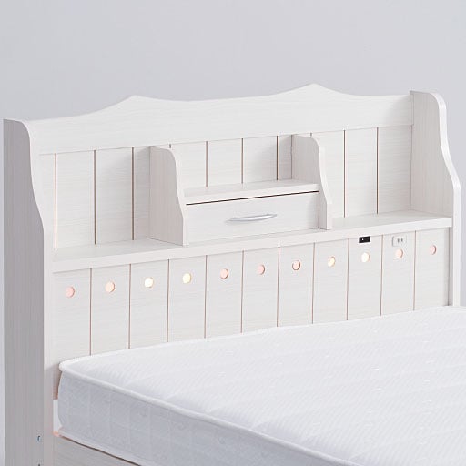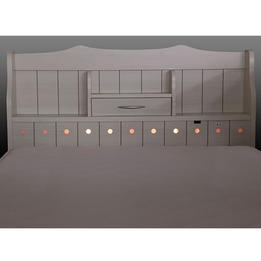 ベッドの凝ったつくりのヘッドボードは、アクセントライト、小引き出し、一口コンセントなどが付き、使い勝手も考えられた仕様です。