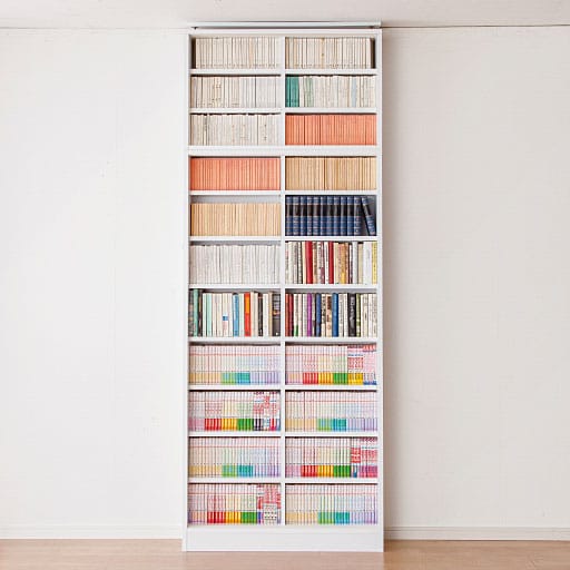 大容量なのに見た目スッキリ! 引き戸タイプの壁面収納本棚です。大量の本やDVD・CDを収納しても反りにくい頑丈な棚板を使用した日本製。上置きも併用すれば壁一面が収納庫に。棚板の高さを1cm単位で調整できるので、無駄なスペースを作らずたっぷり収納できます。