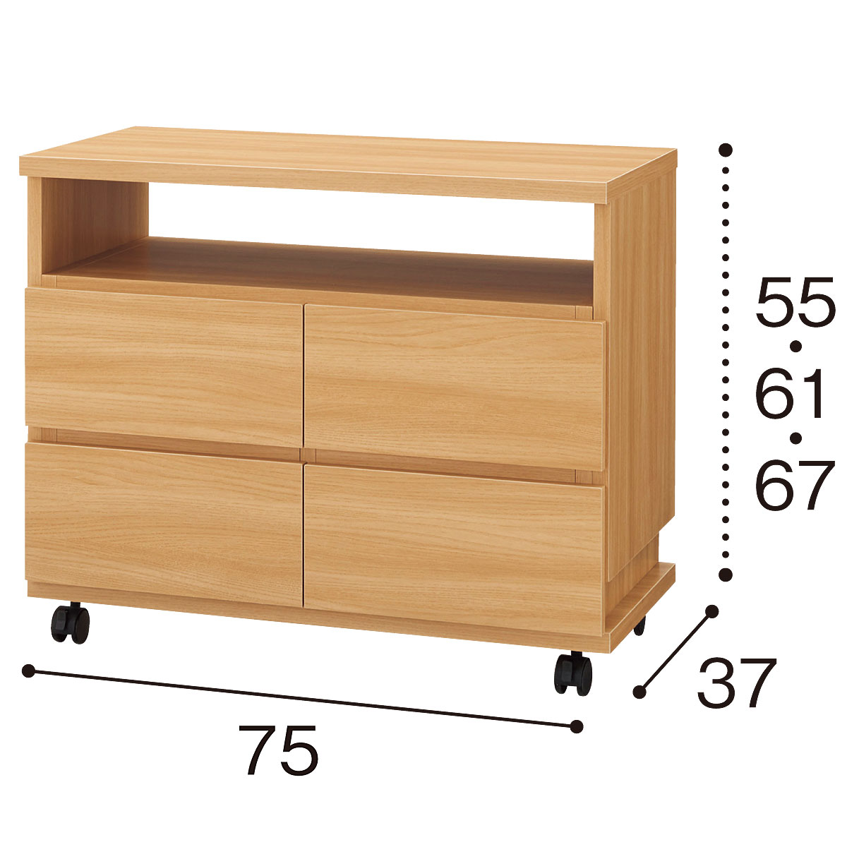 ■サイズ(cm)/[引き出し内寸(A)]幅(小)22(大)48×奥行28×深さ15 [引き出し内寸(B)]幅29×奥行28×深さ15 [オープン収納部内寸]幅A:55 B:70×奥行34×高さ6/12/18 ■[天板・前板]強化プリント紙化粧繊維板 [その他]プリント紙化粧繊維板 ■耐荷重(kg)/[天板]15 [中天板]10■重量(kg)/A:20 B:24 ●キャスター4個付き(うち2個ストッパー付き)●日本製【組立式】(キャスターのみ取り付け)【大型別配送】(Aは小型)※「設置サービス」・「組立+設置サービス」をご利用の場合は大型別配送扱いとなります。※沖縄県や一部島しょ部など配送上の都合によりお届けできない地域がございます。