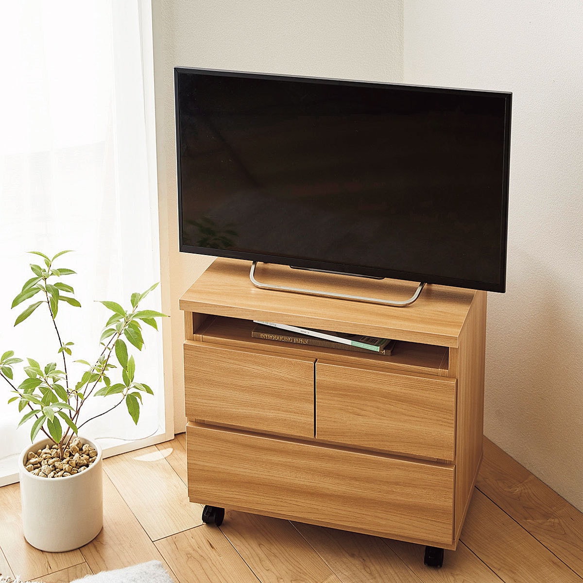 ベッドでソファで、テレビを見たい場所にサッと移動。天板を3段階の高さで昇降設置できるテレビ台です。キャスター付きで簡単に移動でき、テレビの向きも見やすい角度に動かせます。簡単に移動できるので、背面の掃除も簡単。