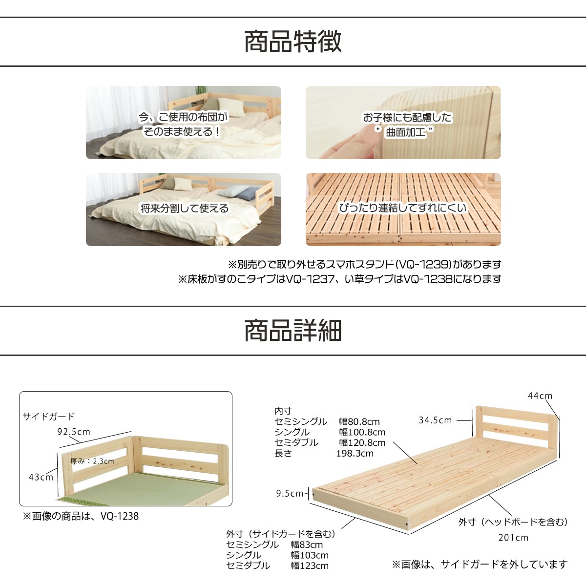 ■サイズ(約cm)/[外寸法]幅 セミシングル:83 シングル:103 セミダブル:123×奥行201×高さ44(床面高さ9.5) [サイドガード]幅92.5×高さ43 [床面有効寸法]幅 セミシングル:80 シングル:100 セミダブル:120×奥行198 ■[フレーム]天然木ひのき材 [すのこ]天然木ひのき材、合板 ■重量(kg)/セミシングル:23 シングル:27 セミダブル:31 ■セミシングル・シングルは1個口、セミダブルは2個口でお届け●日本製【すのこ】 【大型別配送】 【天然木】(ひのき材)【組立式(2人で)30分程度】 ※沖縄県や一部島しょ部など配送上の都合によりお届けできない地域がございます。