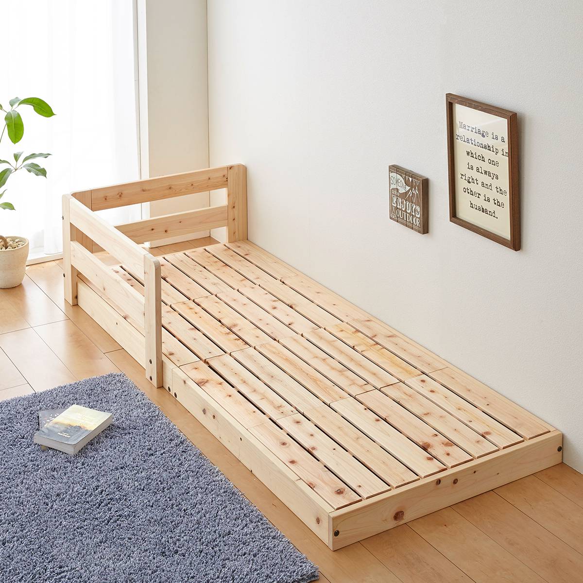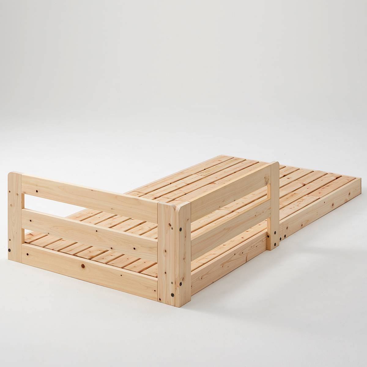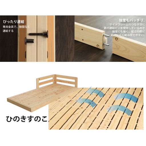 並べても段差ができず、家族川の字でお休みになれる国産ひのきベッドです。ライフスタイルの変化に合わせて自由に組み合わせ可能です。通気性の良いすのこは厚さも十分でしっかりとしたつくり。布団のずり落ちを防ぐサイドガードつき。一年を通して快適にお使いいただけます。
