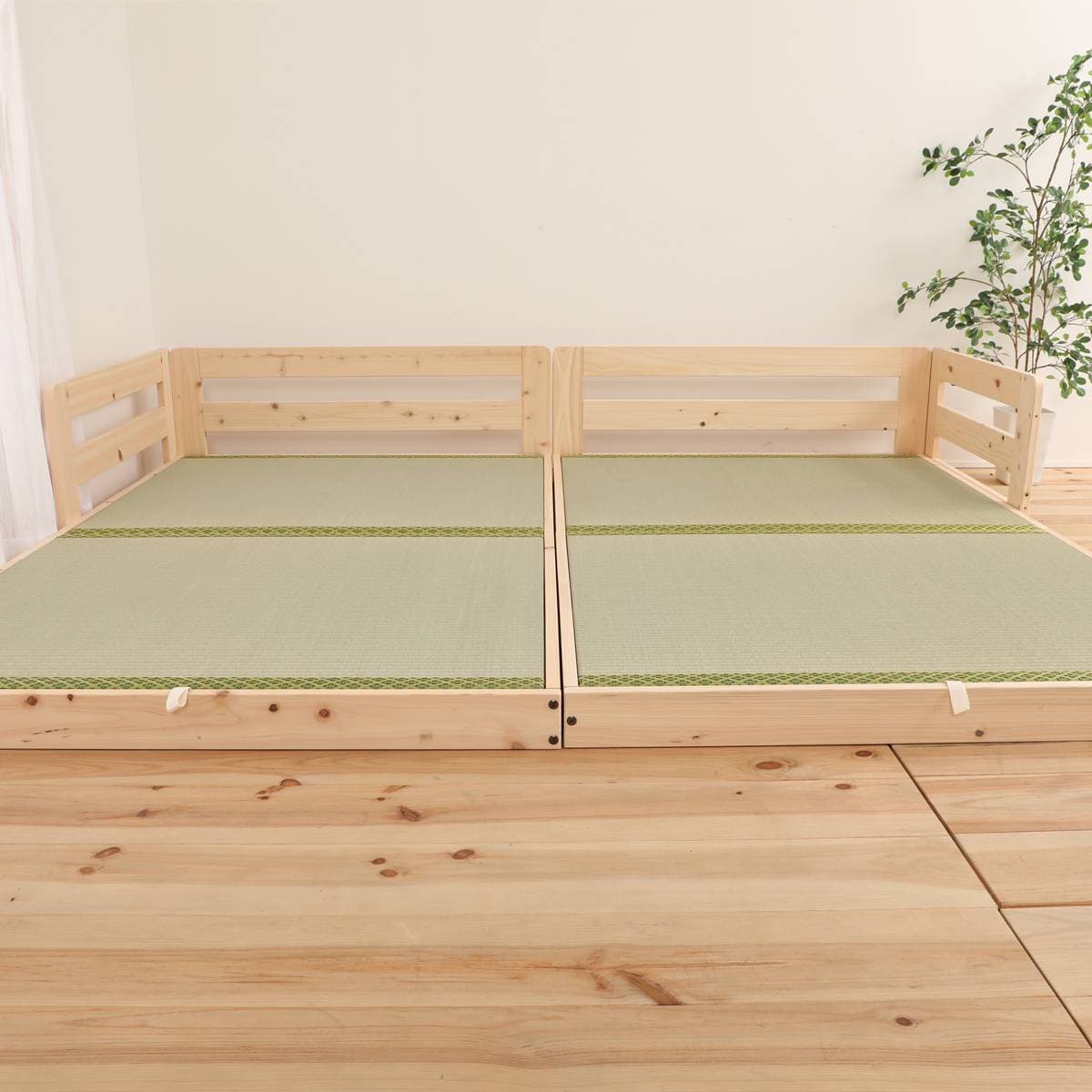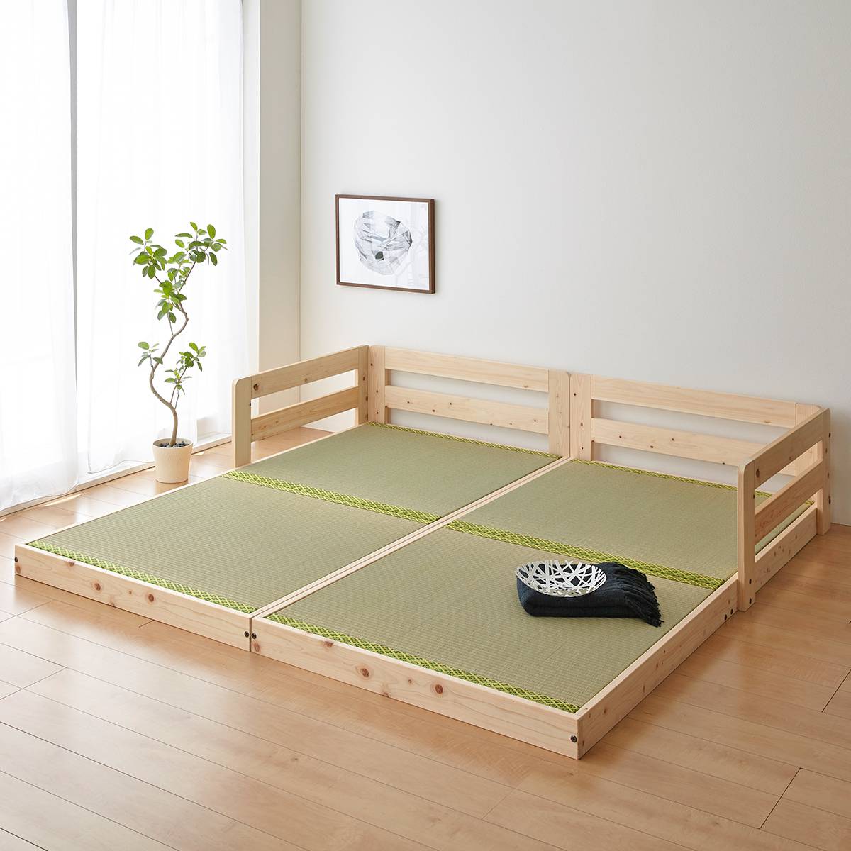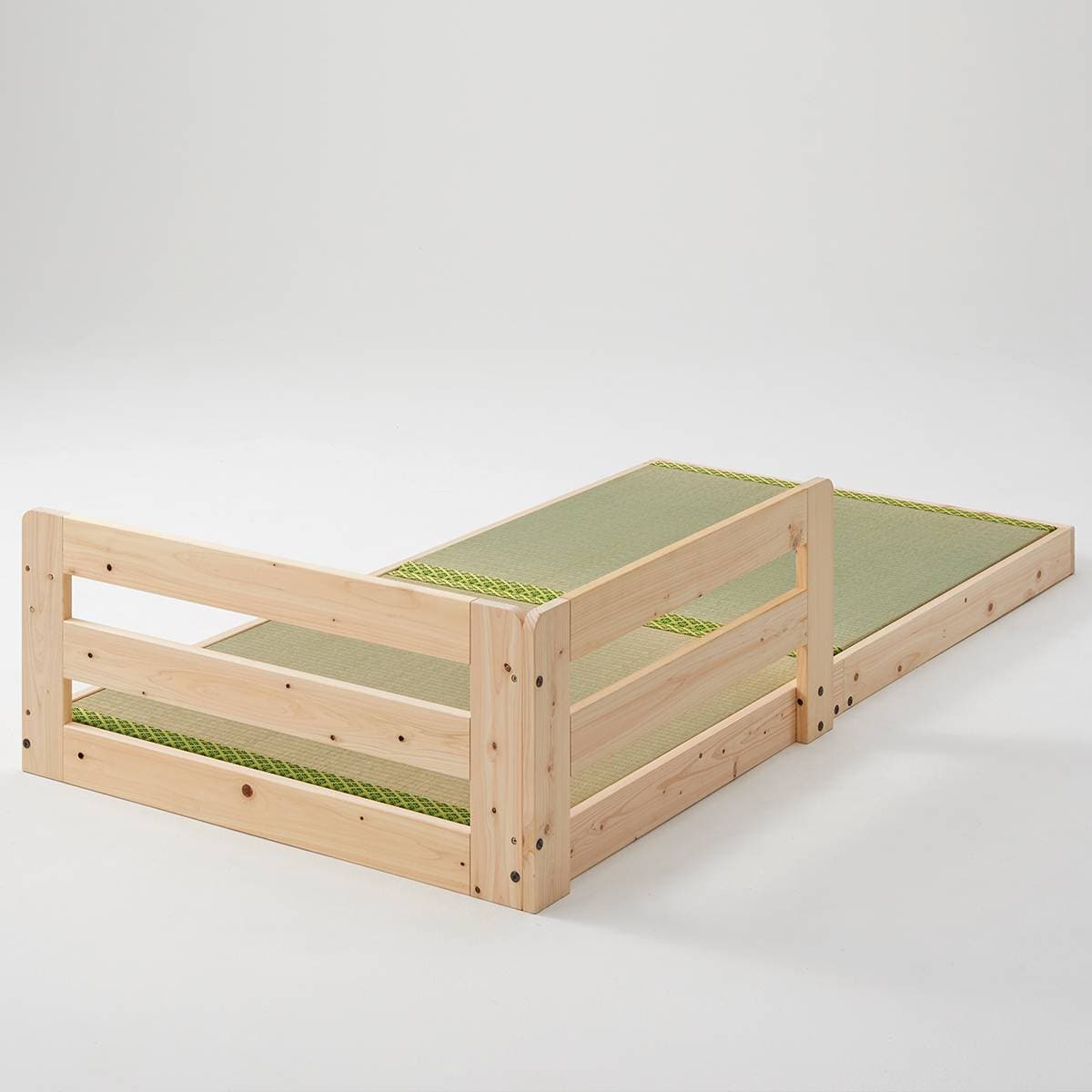 並べても段差ができず、家族川の字でお休みになれる国産ひのきベッドです。ライフスタイルの変化に合わせて自由に組み合わせ可能です。い草の香りでリラックスしてお休みください。布団のずり落ちを防ぐサイドガードつき。一年を通して快適にお使いいただけます。