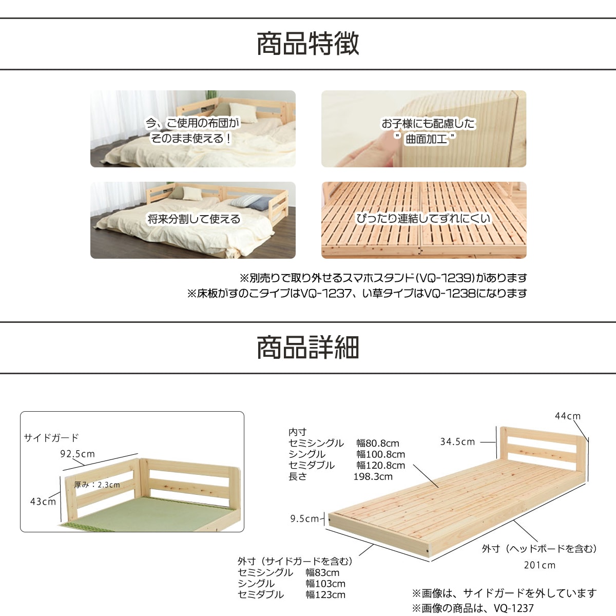 ■サイズ(約cm)/[外寸法]幅 シングル:103 セミダブル:123×奥行201×高さ44(床面高さ9.5) [サイドガード]幅92.5×高さ43 [床面有効寸法]幅 シングル:100 セミダブル:120×奥行198 ■[フレーム]天然木ひのき材 [床板]い草、ハードボード ■重量(kg)/シングル:27 セミダブル:31 ■2個口でお届け●日本製【い草】 【大型別配送】 【天然木】(ひのき材)【組立式(2人で)30分程度】 ※沖縄県や一部島しょ部など配送上の都合によりお届けできない地域がございます。