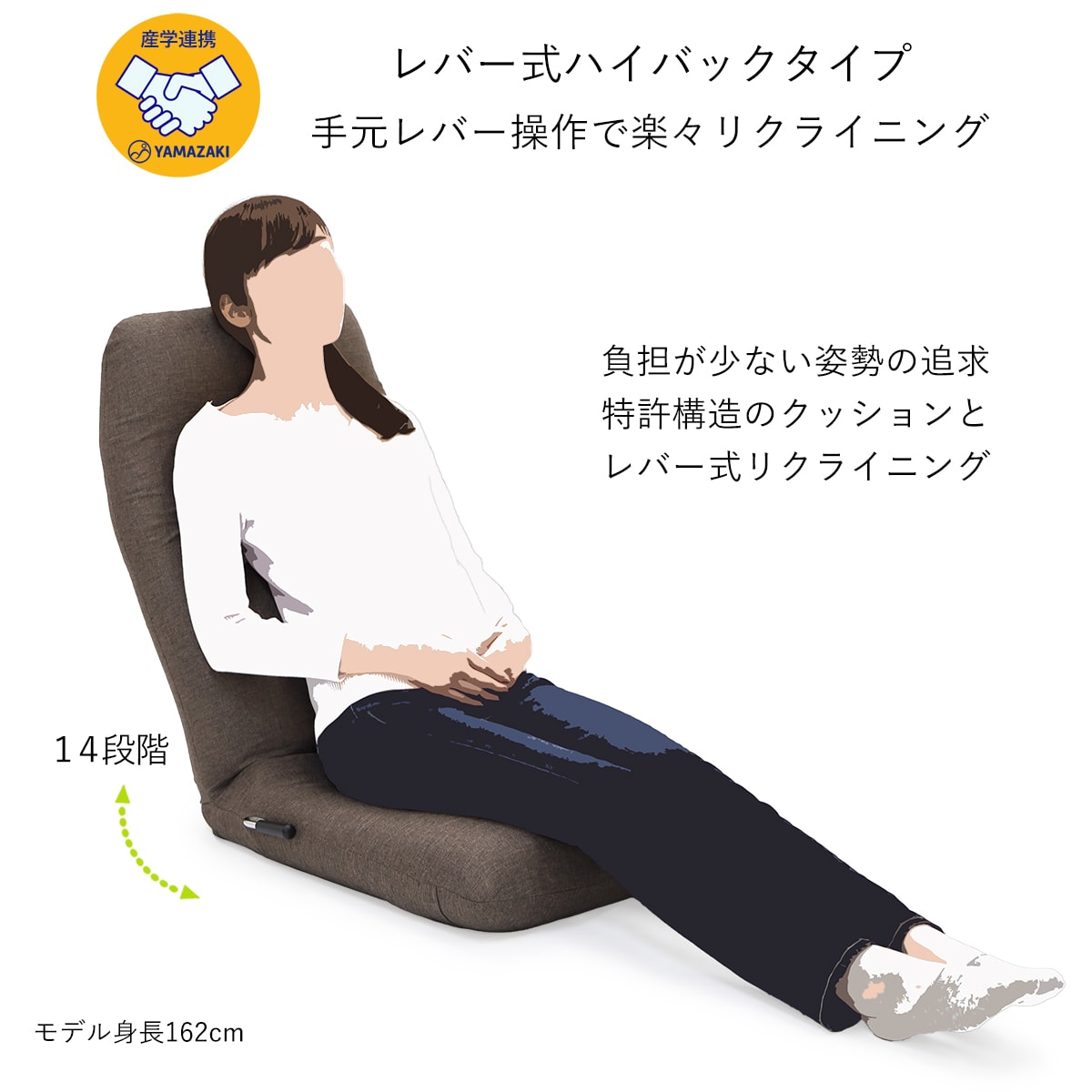 産学共同研究から開発したウレタン積層構造クッションで姿勢をサポートする、レバー式ハイバック座椅子です。背もたれ部分がS字カーブをサポートし、お尻にかかる体重圧も分散。腰の負担を軽減する姿勢をキープします。手の平で背中を支えられているような安定感で、長時間座っても疲れにくい座椅子を目指しました。側生地はサラッとした上質な肌ざわり。手元のレバーで、座ったまま15段階にリクライニング調整できます。