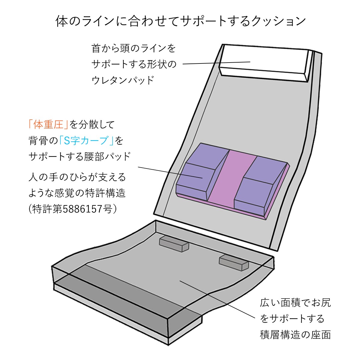 身体との隙間を減らし、負担が少ない姿勢をサポートします。