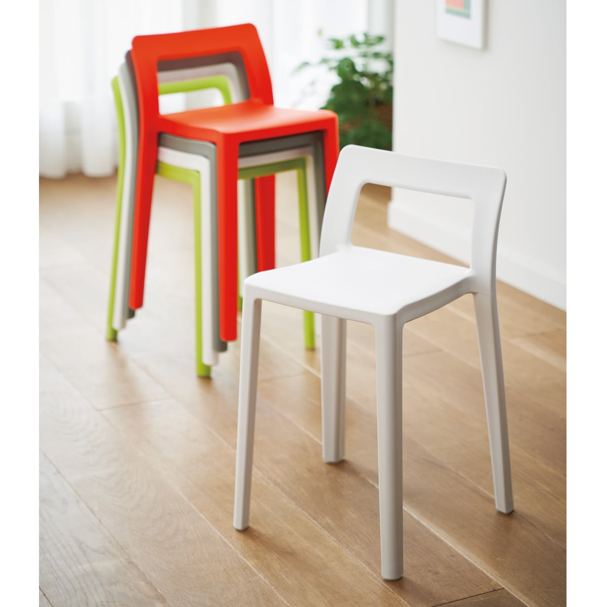 人が安定して座れる最小限のサイズをコンセプトに作られたスタッキングチェアです。限られた居住スペースでも邪魔にならず、日本人の体型にフィットするように座面幅や背もたれの高さにこだわって設計されました。欧米の椅子と比較するとコンパクトで軽量なので、移動やお手入れもラクラクです。おしゃれなデザインとカラーでベランダやキッチン・玄関などのアクセントにも。最大8脚までスタッキングできるので、来客用やコミュニティスペースにもおすすめです。
