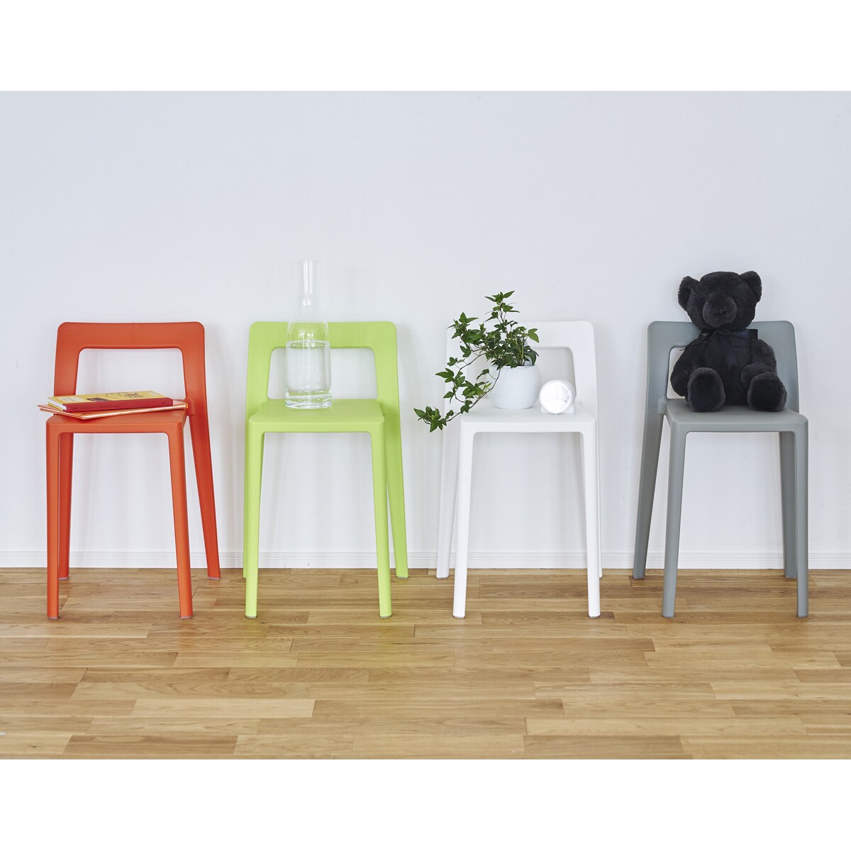 (左から) オレンジ・グリーン・ホワイト・グレーおしゃれなデザインとカラーでインテリアのアクセントにも。