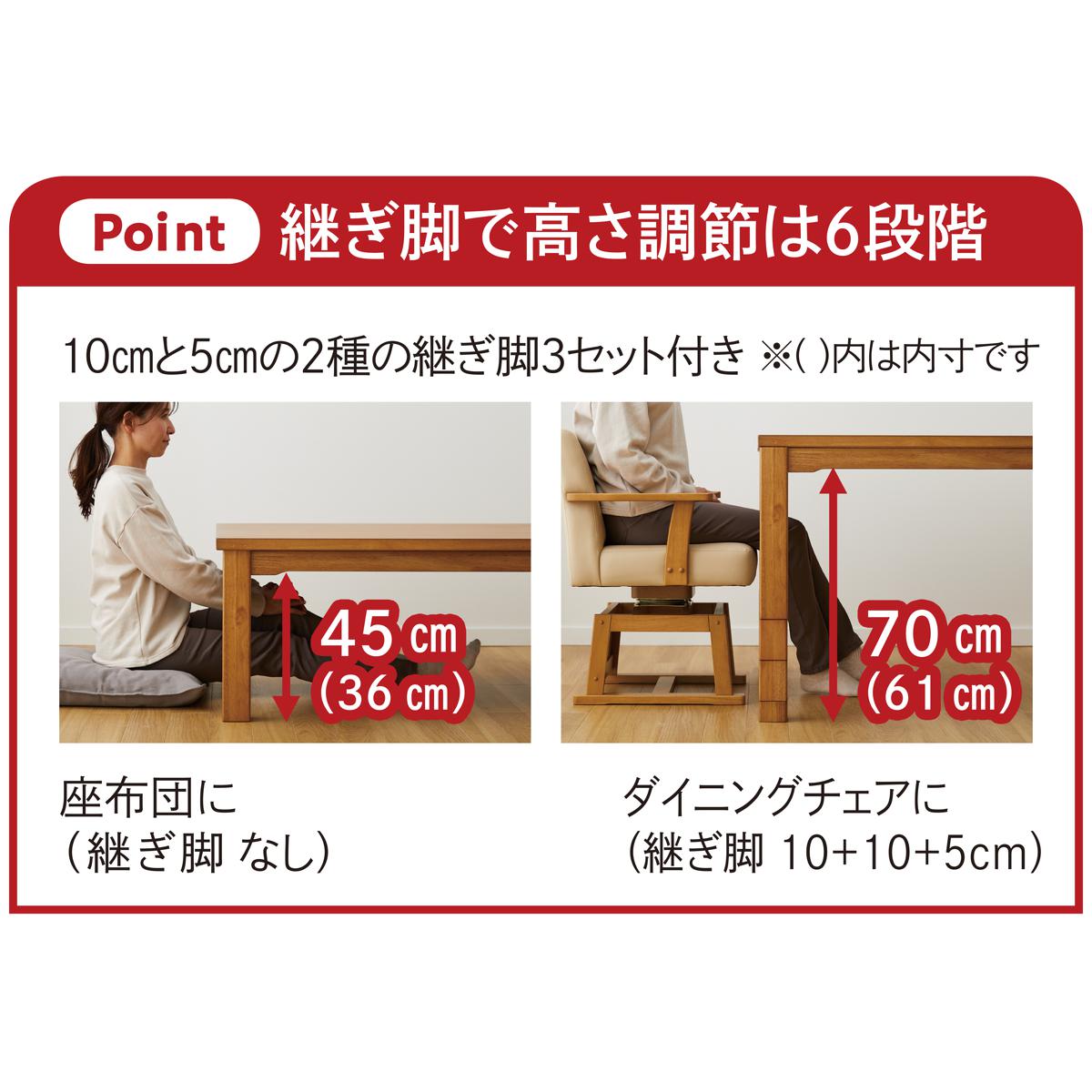 オールシーズン使用できる、快適こたつテーブル&こたつ掛け布団セットです。テーブルは継ぎ脚付きで高さ調節できるので、ダイニングテーブルとしてもローテーブルとしても使えます。