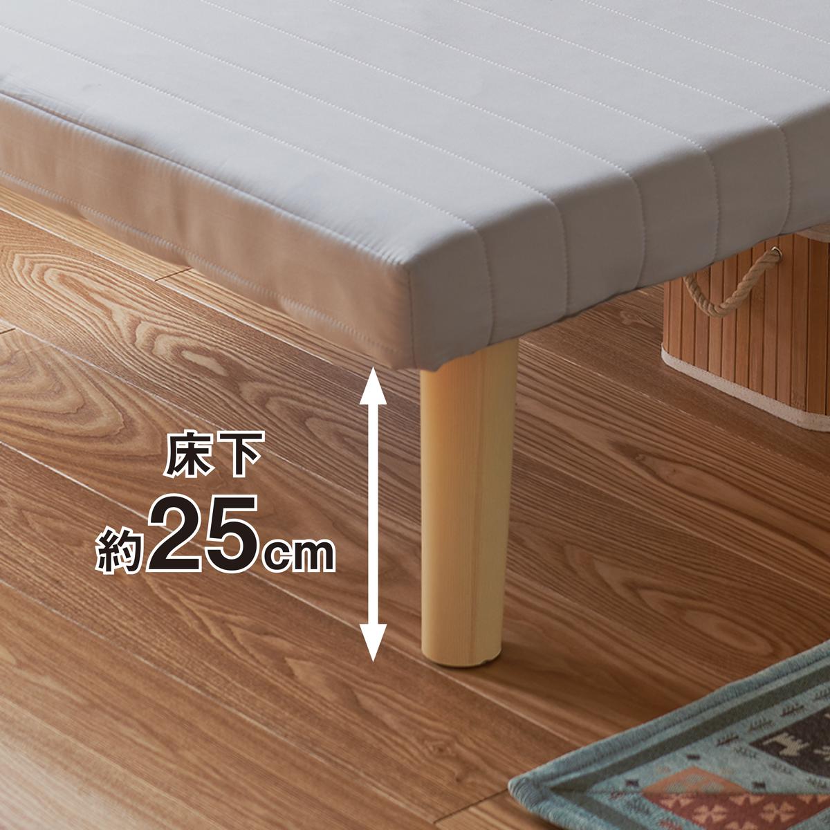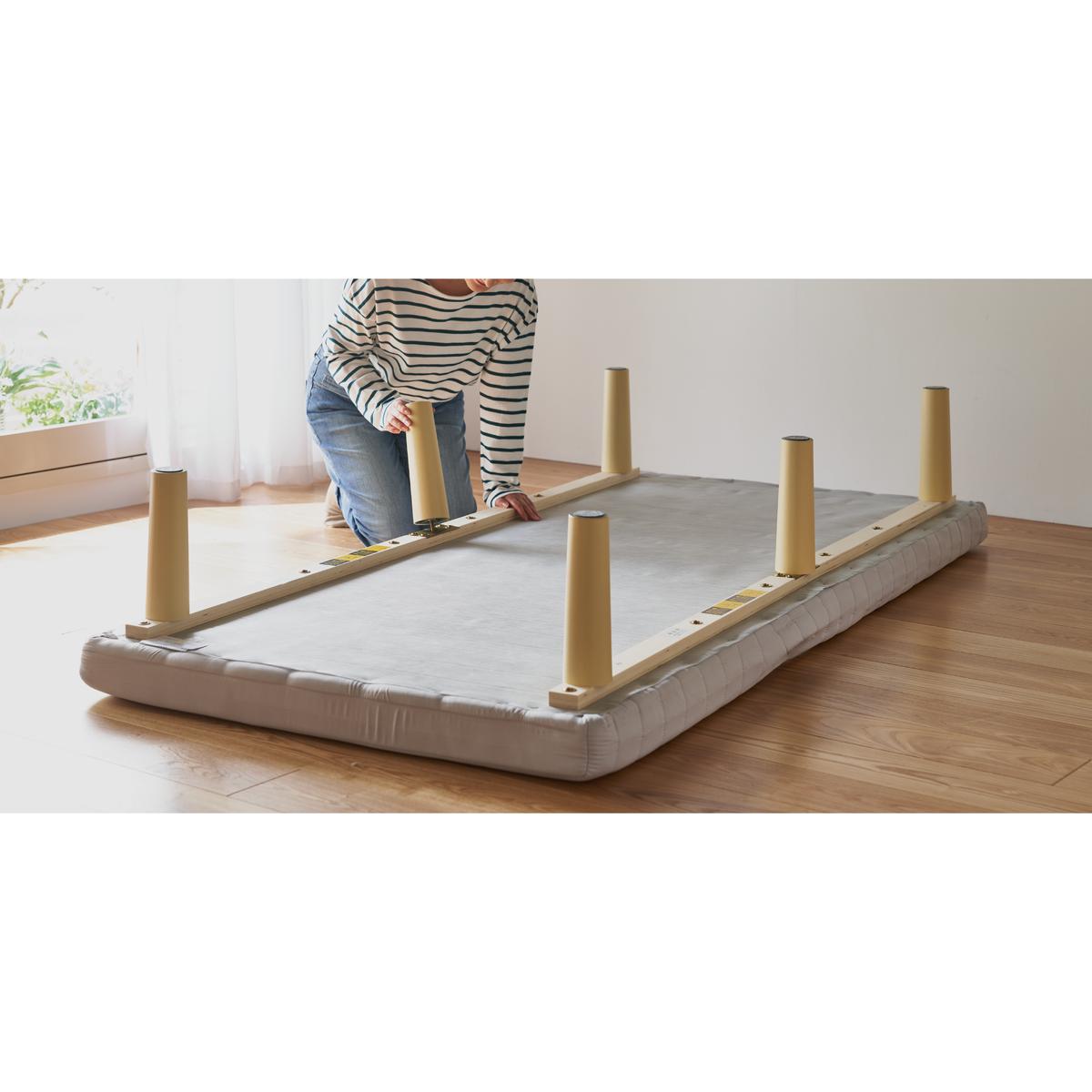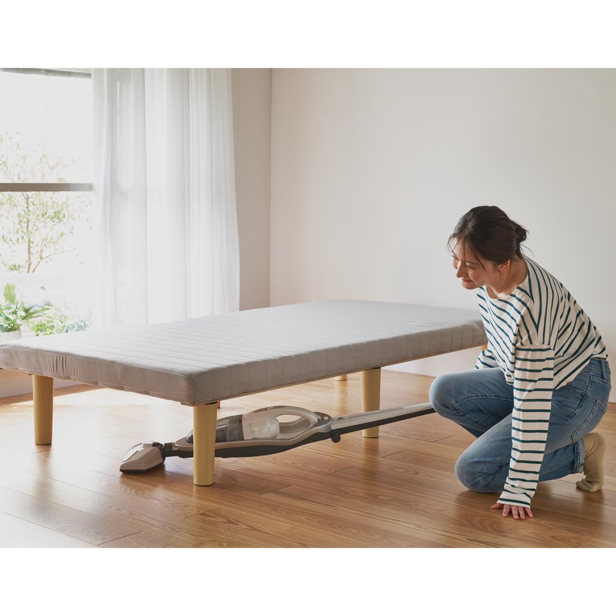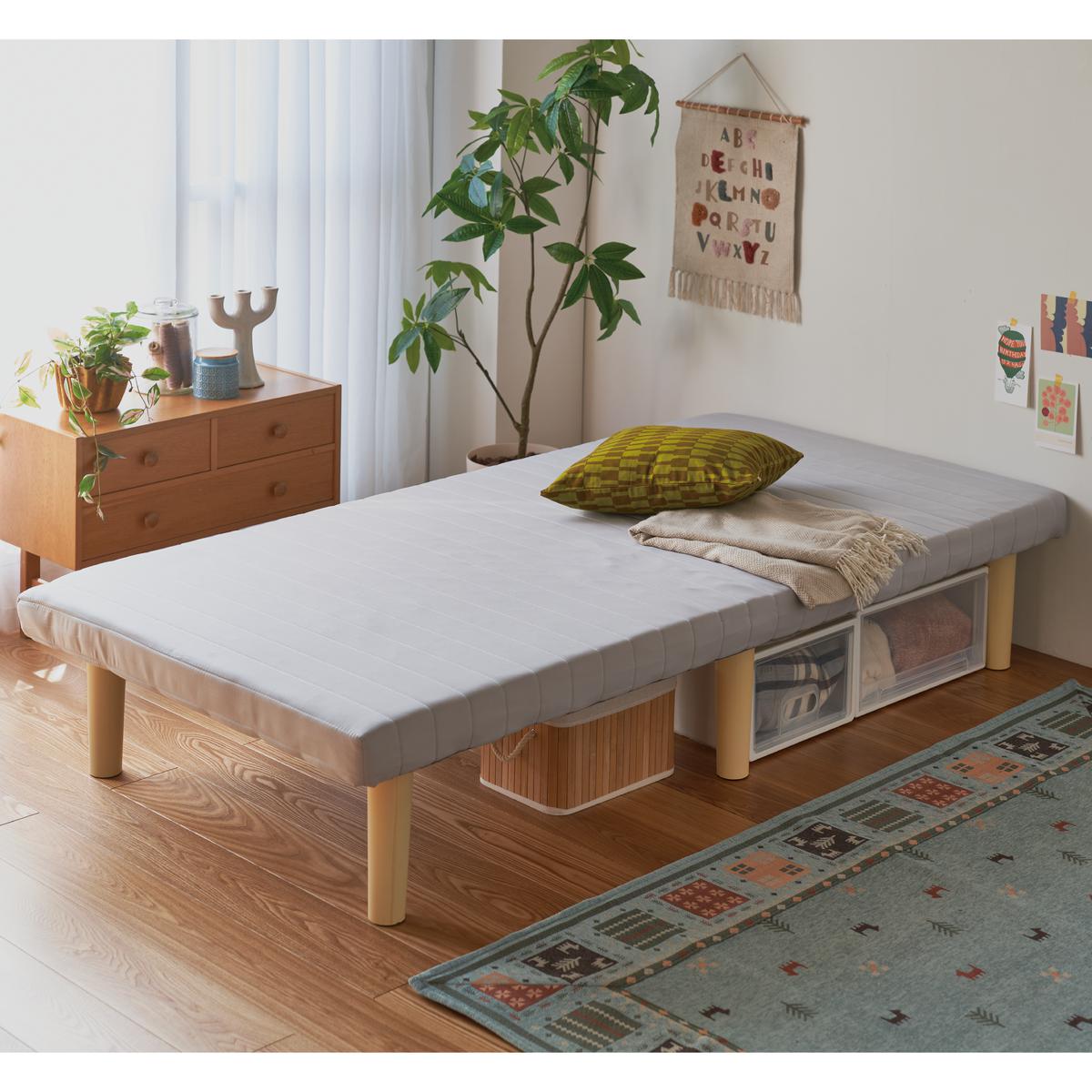 省スペースタイプの脚付きマットレスです。広げたマットレスに木桟・連結用金具を固定し、脚を取りつけるだけの簡単組み立て。女性一人でもラクラク設置できます。ベッド下は高さ約25cmまでのケースが収納可能。掃除機やワイパーもスッと入るのでお掃除も簡単です。マットレスは軽くて扱いやすくほどよい硬さのウレタンマットレス、通気性がよく丈夫で耐久性に優れたスプリングマットレスの2種類をご用意しました。一人暮らしの方や狭いお部屋におすすめ。マットレスはロール圧縮して、コンパクトにお届けします。