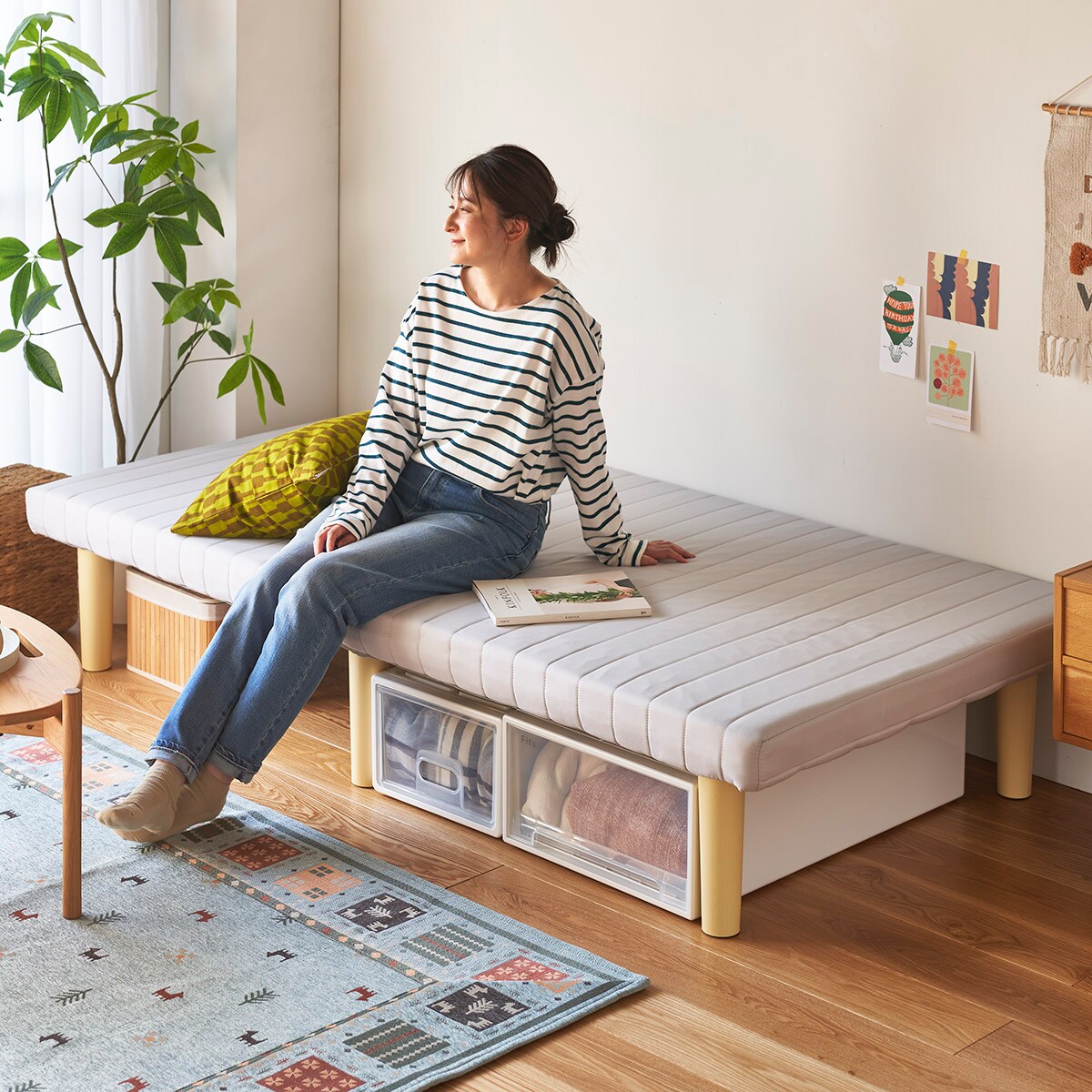 省スペースでお部屋広々! ソファ使いもできる脚付きマットレスです。継ぎ目のないフラットな一体型なので寝心地も快適。ベッド下には収納ケースも入れられます。